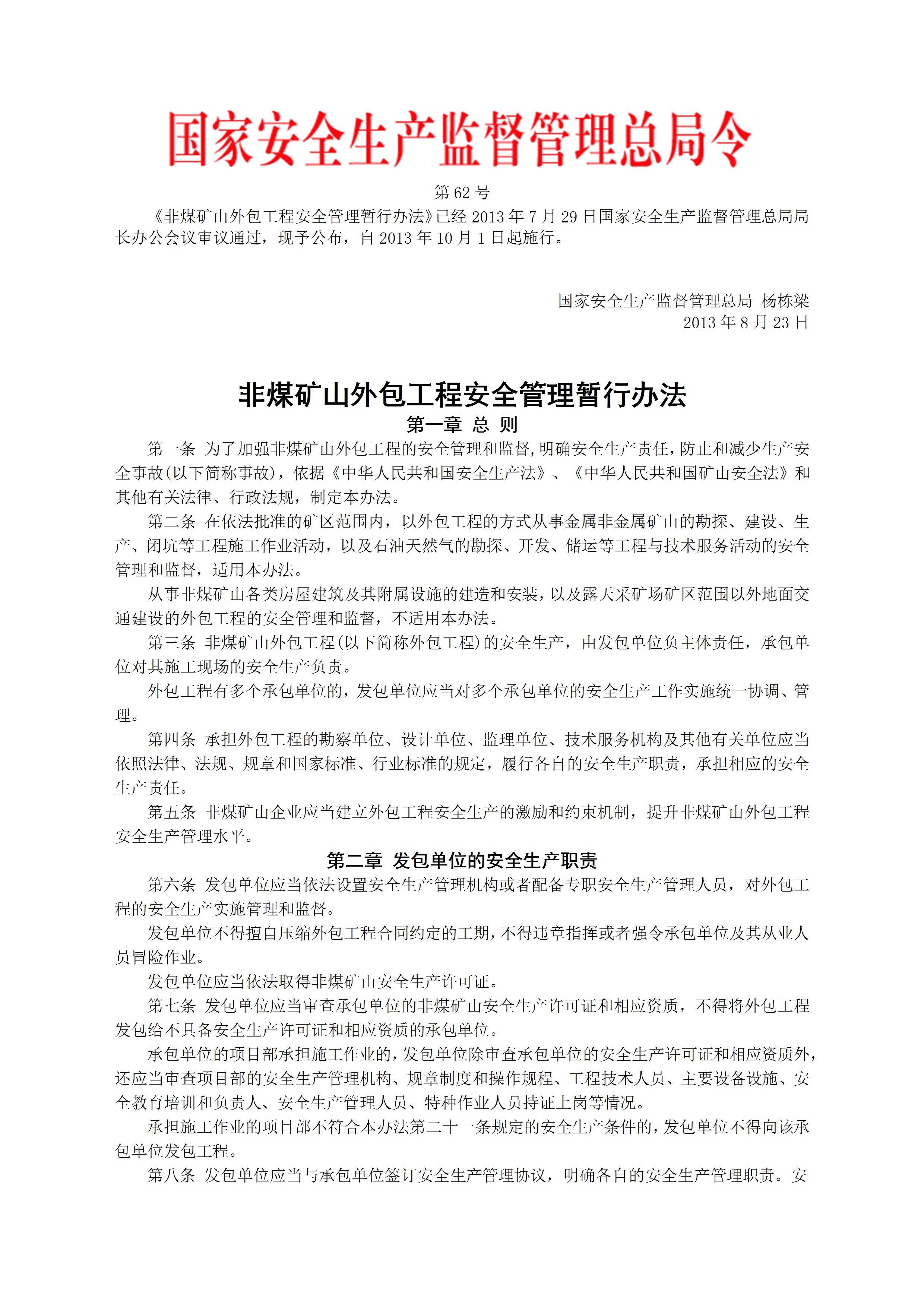 / 国家安监总局令[2013]第62号非煤矿山外包工程安全管理暂行办法