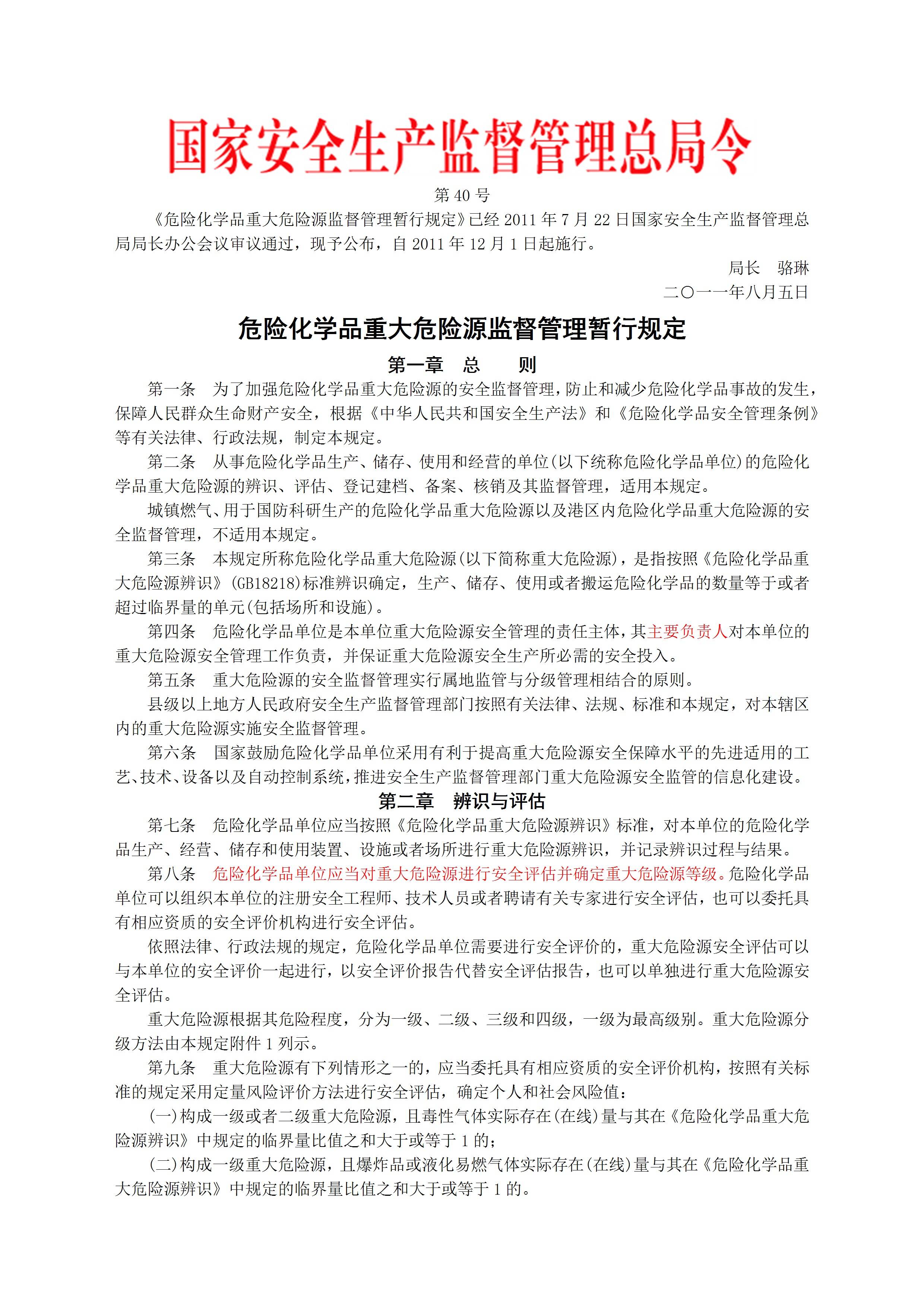 国家安监总局令[2011]第40号危险化学品重大危险源监督管理暂行规定