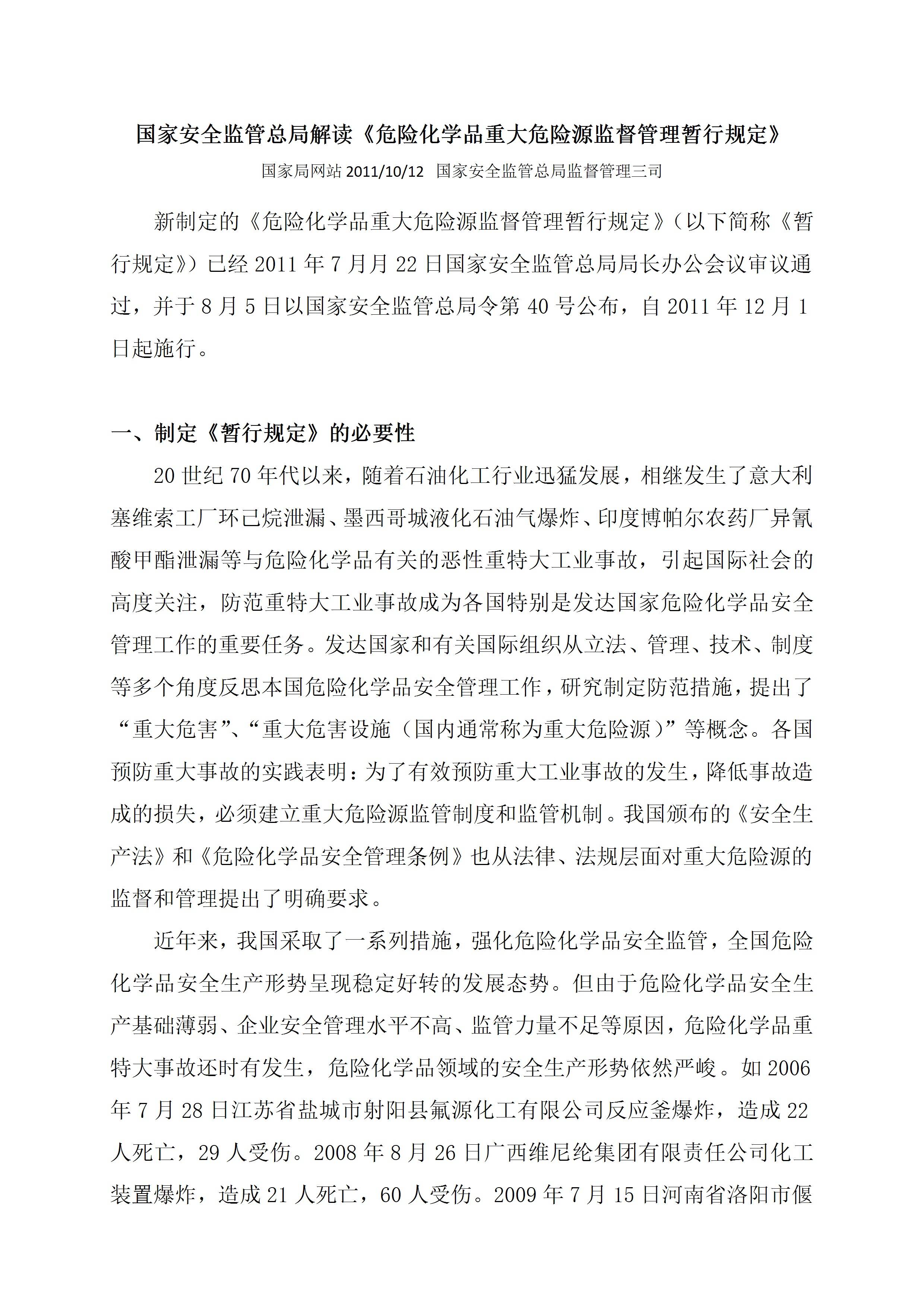 国家安监总局令[2011]第40号危险化学品重大危险源监督管理暂行规定国家安全监管总局解读