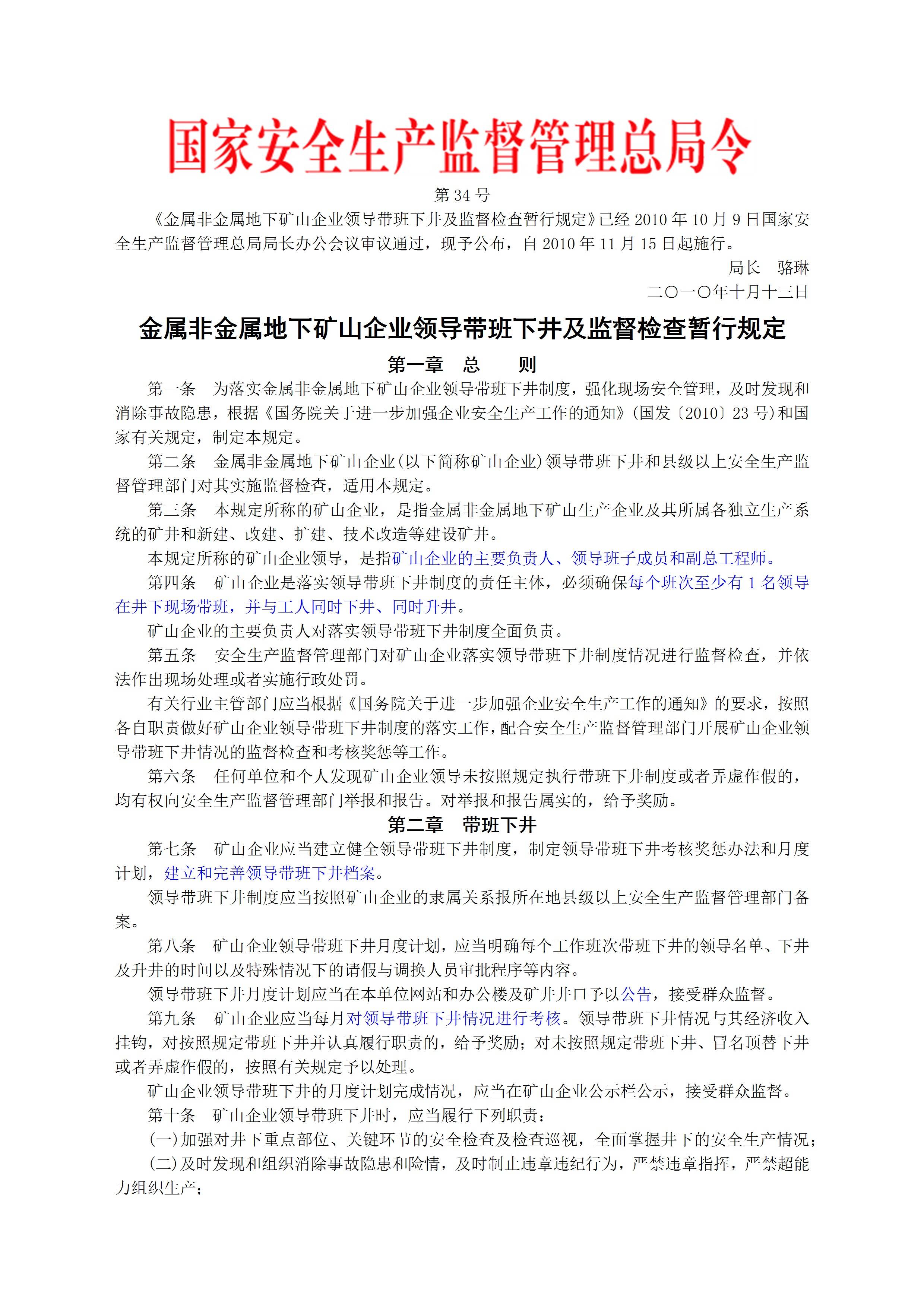 国家安监总局令[2010]第34号金属非金属地下矿山企业领导带班下井及监督检查暂行规定