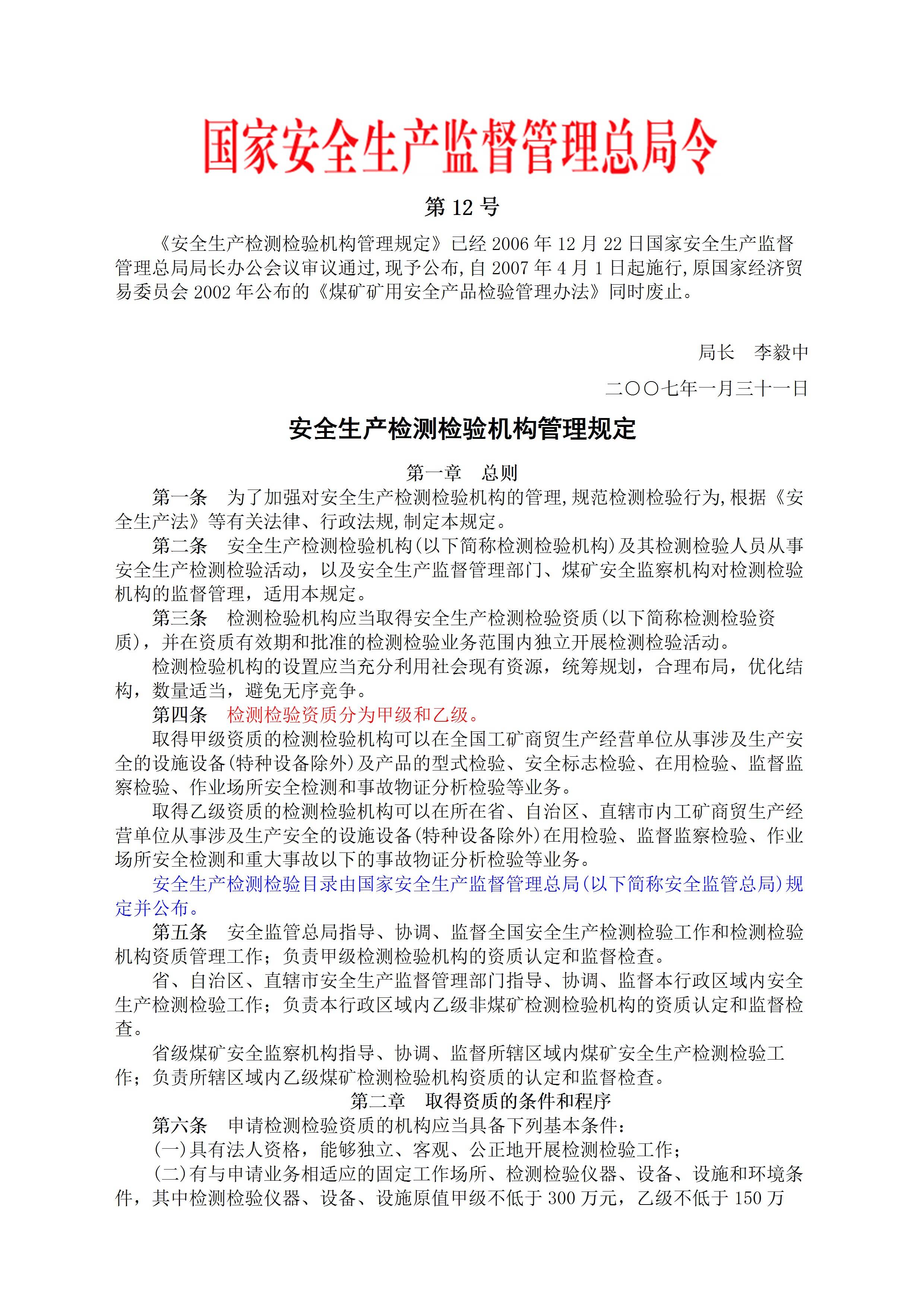 国家安监总局令[2007]第12号安全生产检测检验机构管理规定国家安监总局令2015第80号修改