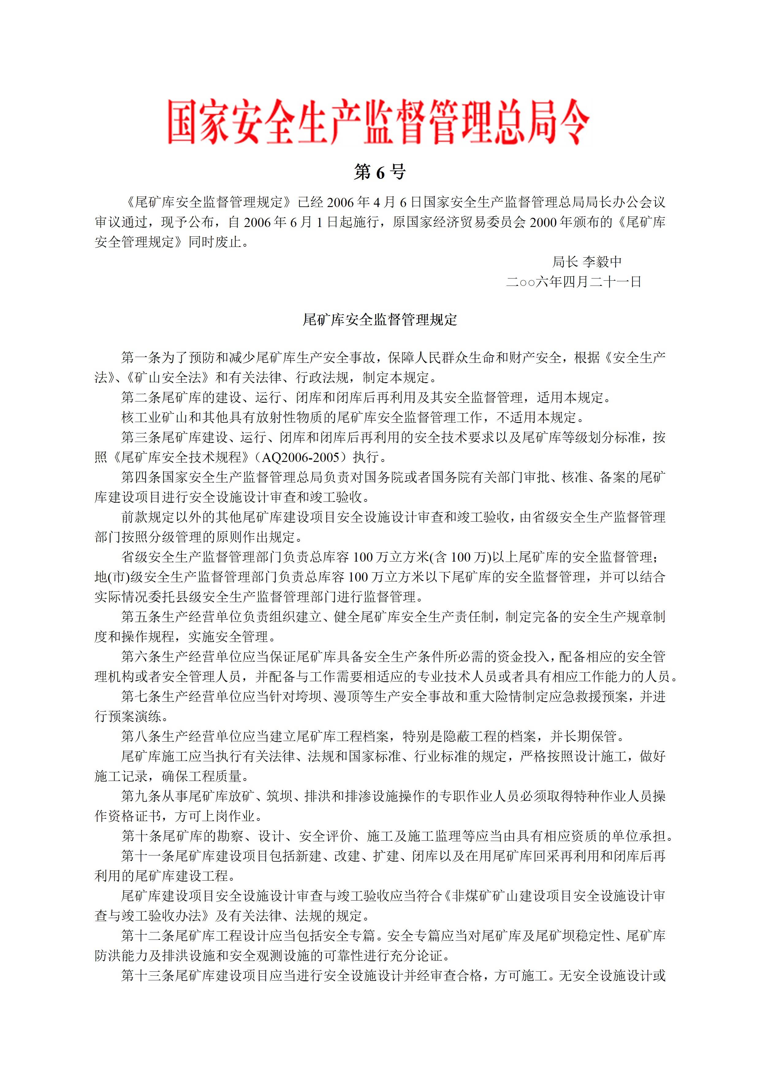 国家安监总局令[2006]第6号尾矿库安全监督管理规定(安监总局令2011第38号废止)
