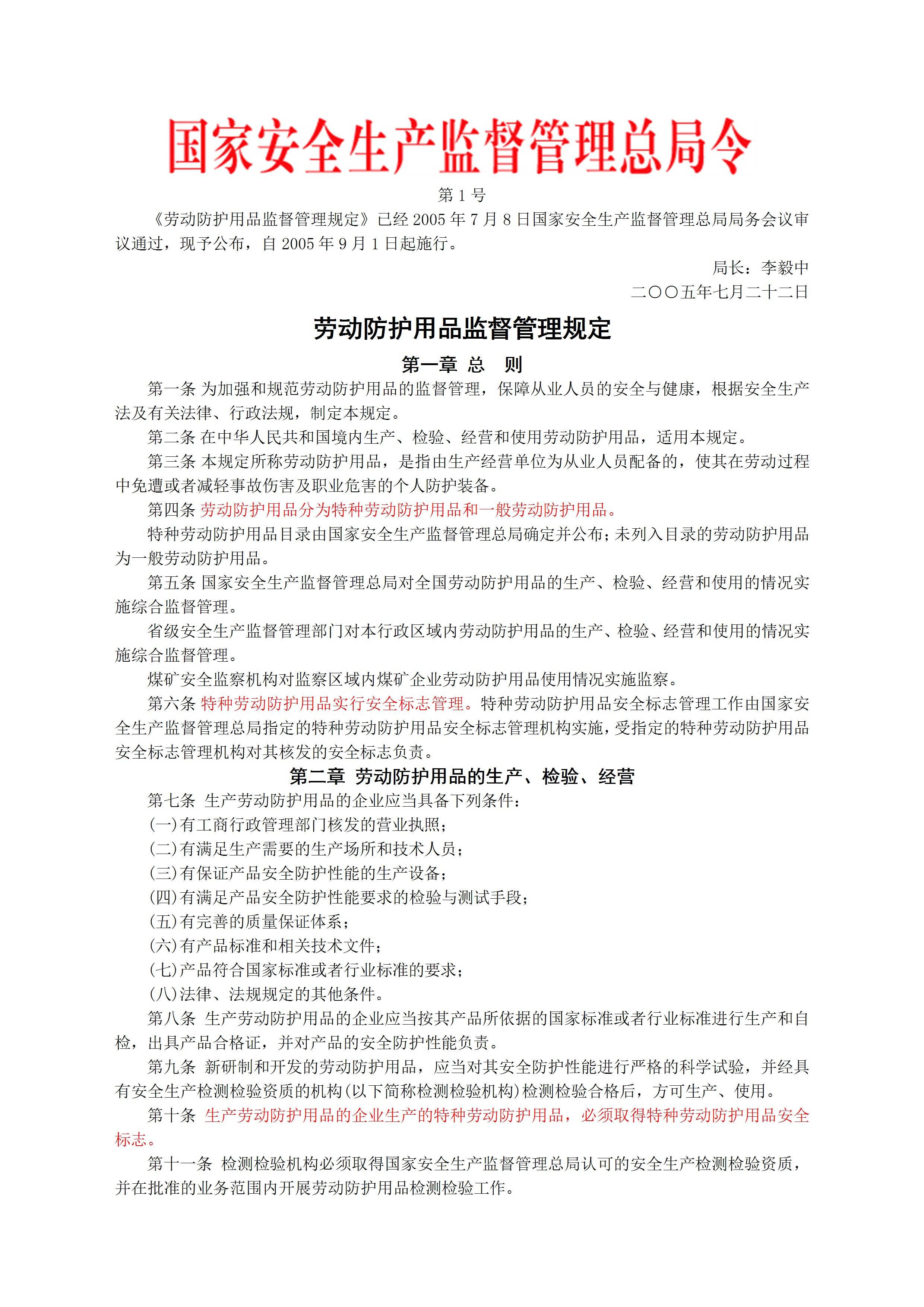国家安监总局令[2005]第1号劳动防护用品监督管理规定(国家安监总局令2015第80号废止)
