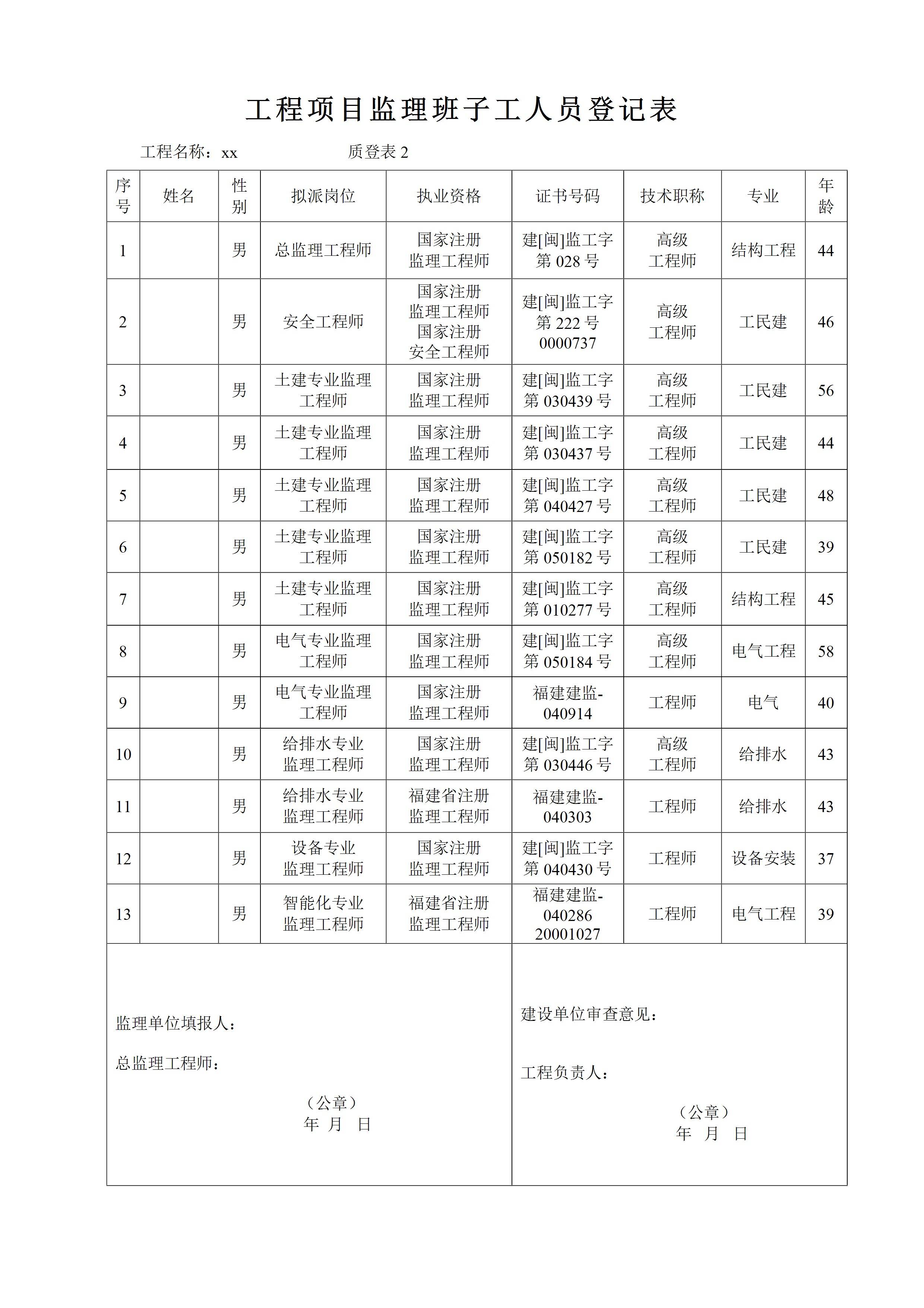 监理班子人员登记表