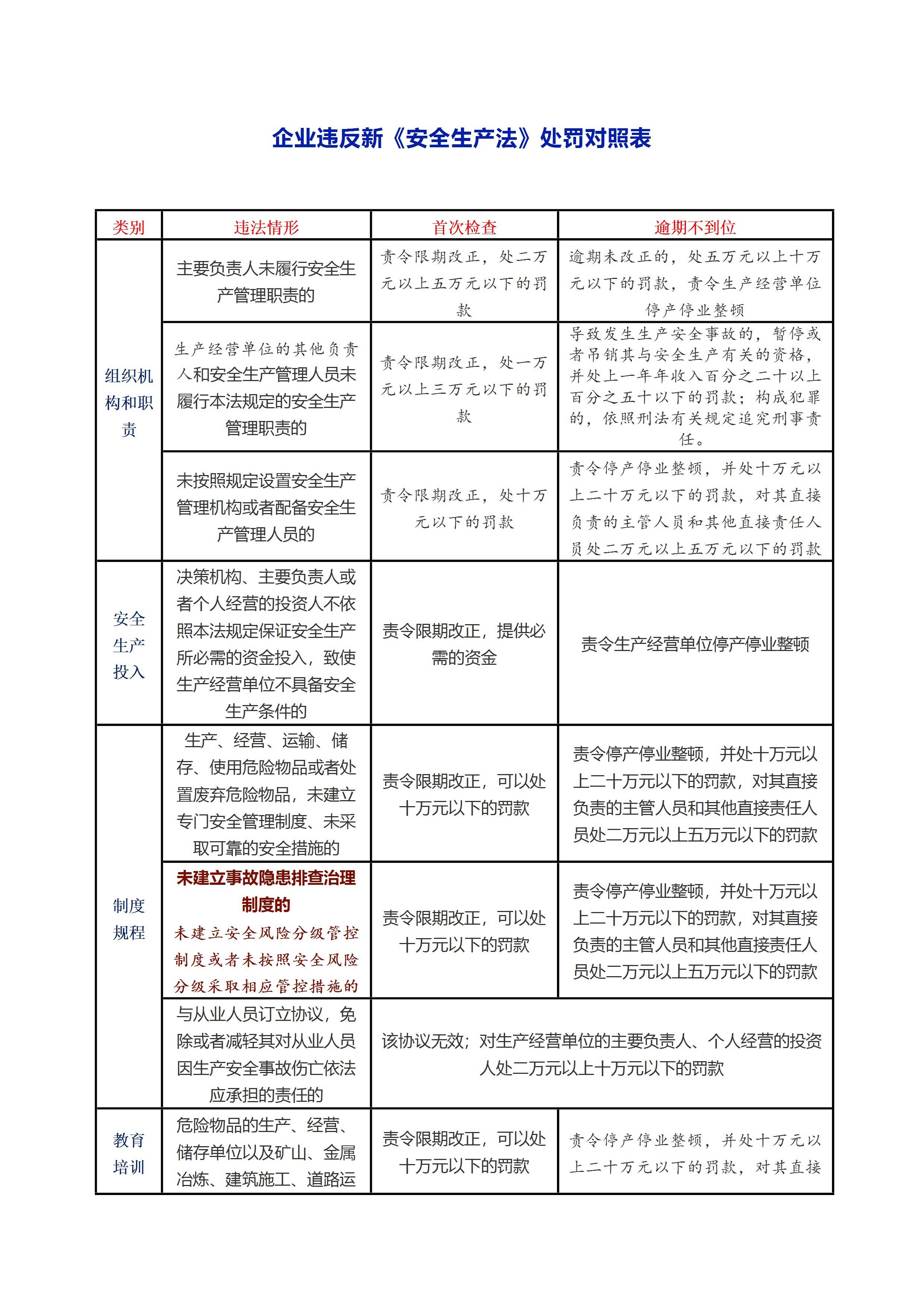 企业违反新《安全生产法》处罚对照表(2021版)[文档]