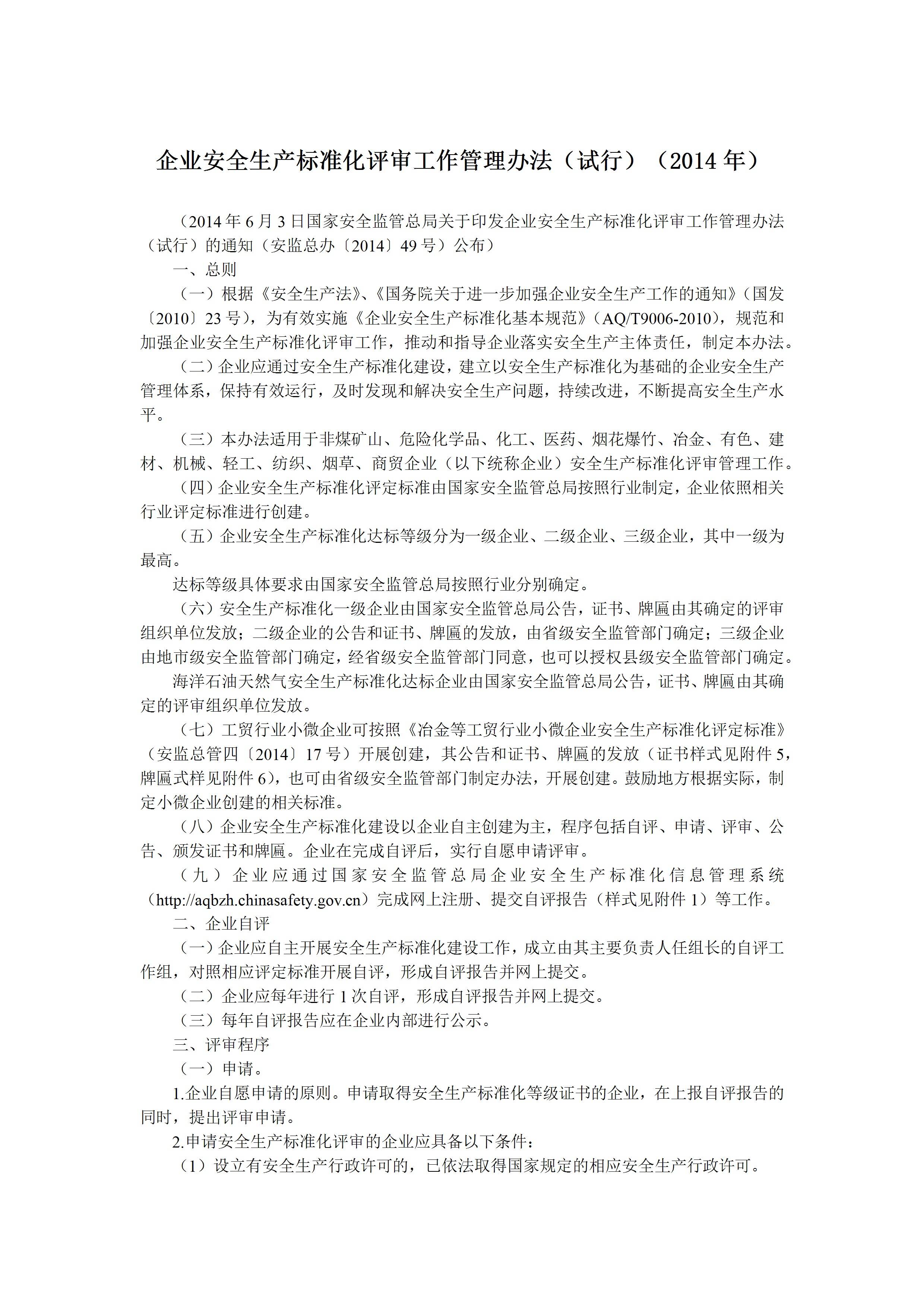 企业安全生产标准化评审工作管理办法(试行)(2014年)[文档]