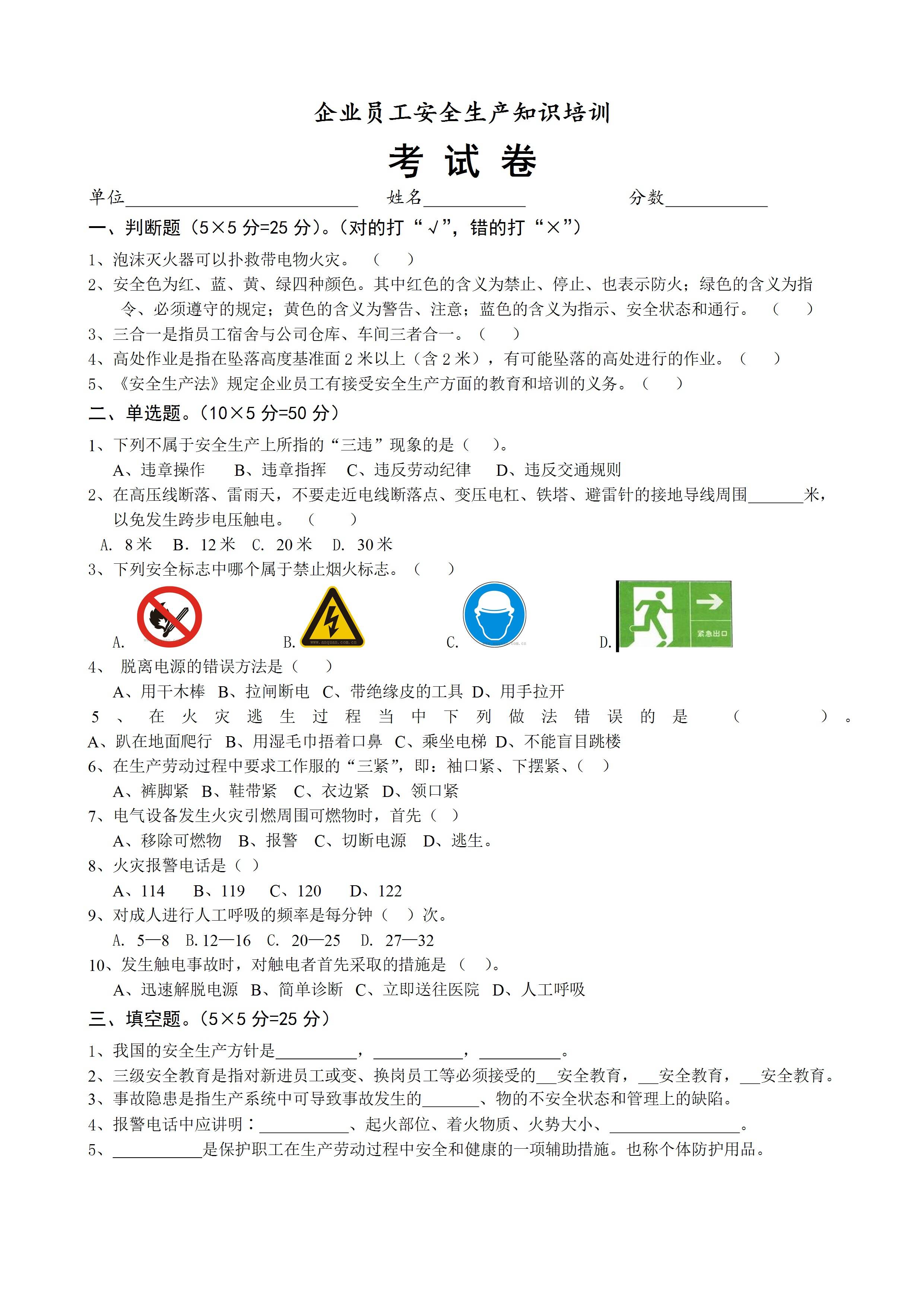 / 企业员工安全生产知识培训考试卷及答案[文档]