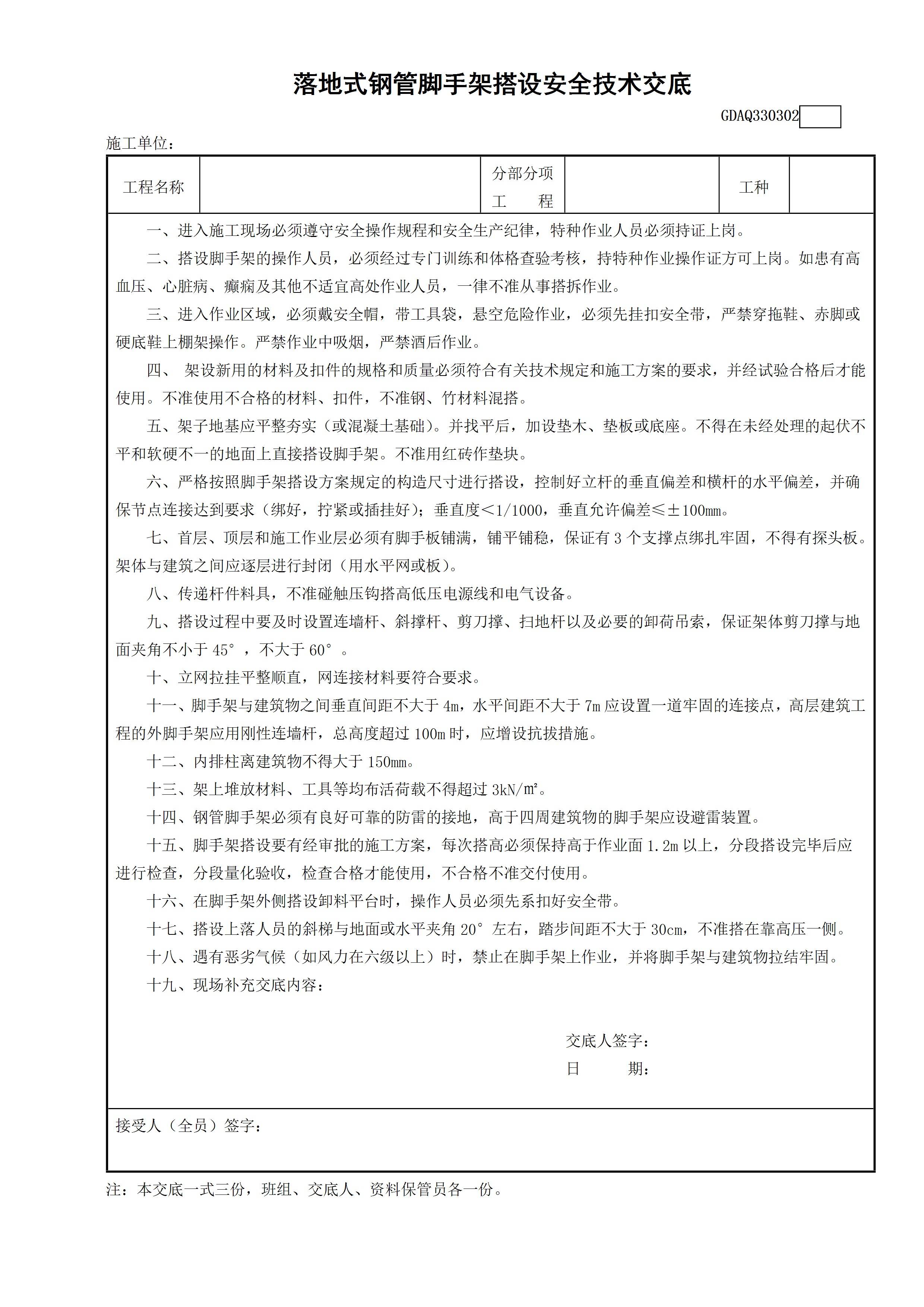 / 落地式钢管外脚手架搭设安全技术交底GDAQ330302[文档]