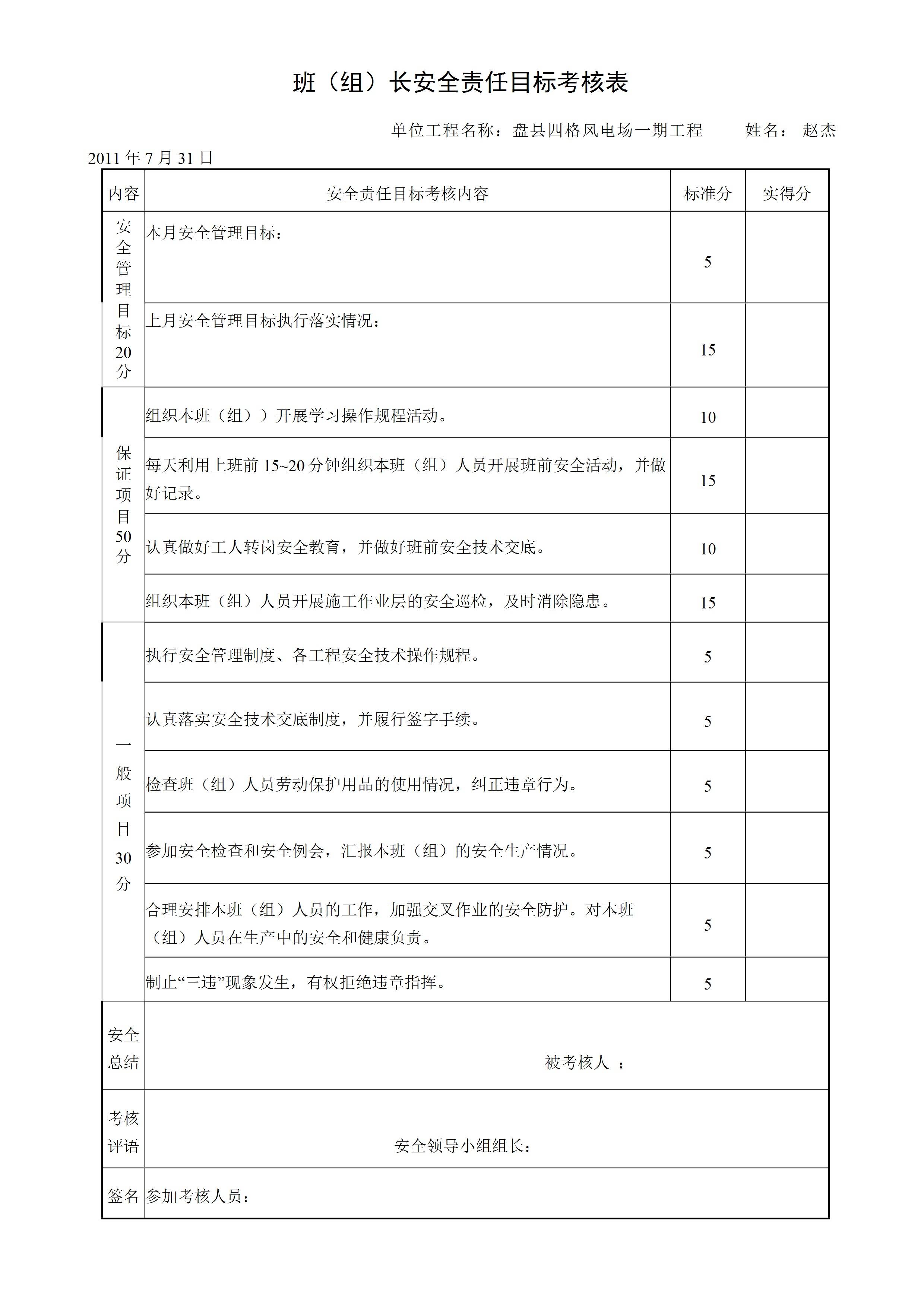 四格班(组)长安全责任目标考核表[文档]