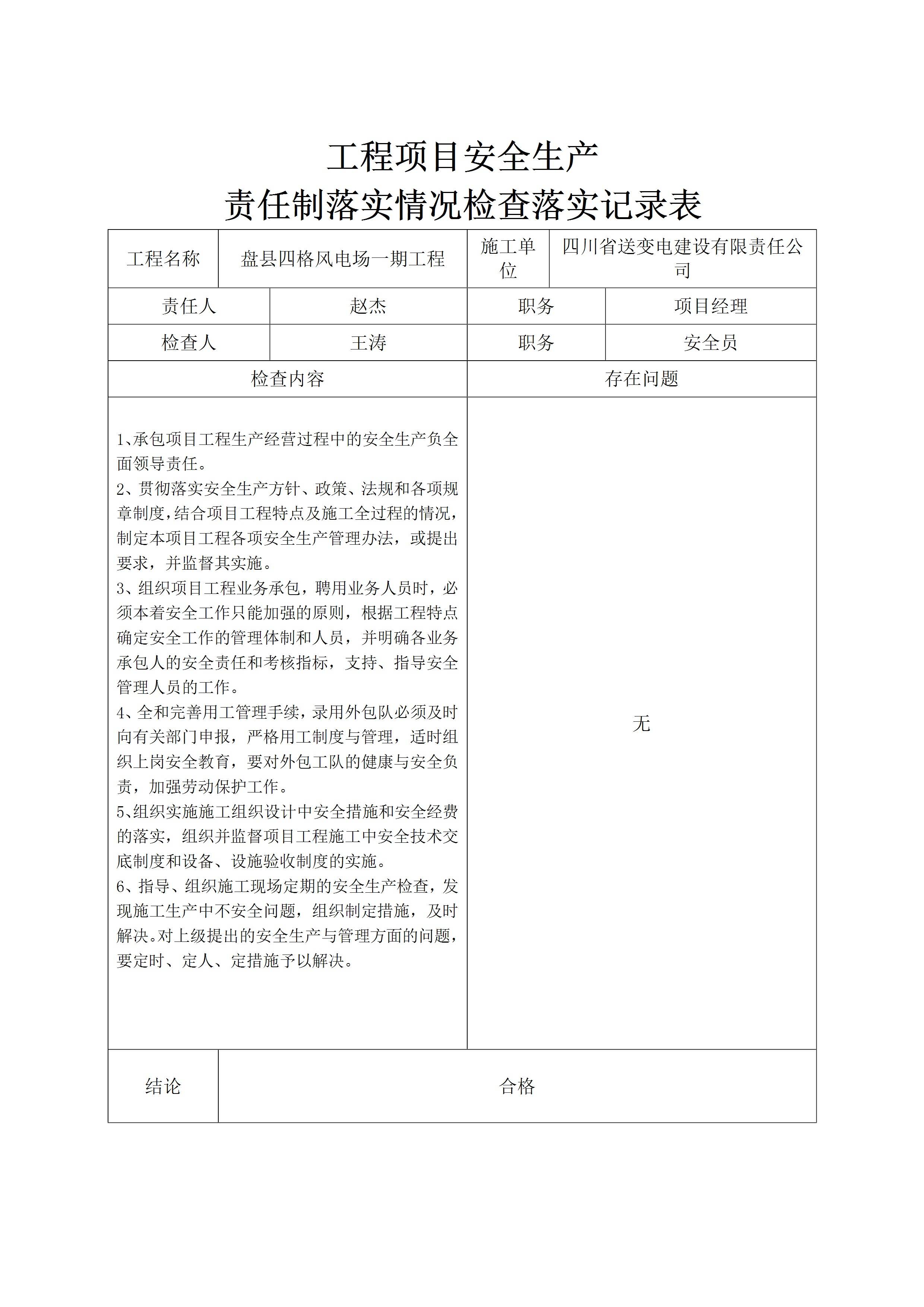 四格工程项目安全生产责任制落实情况检查落实记录表[文档]