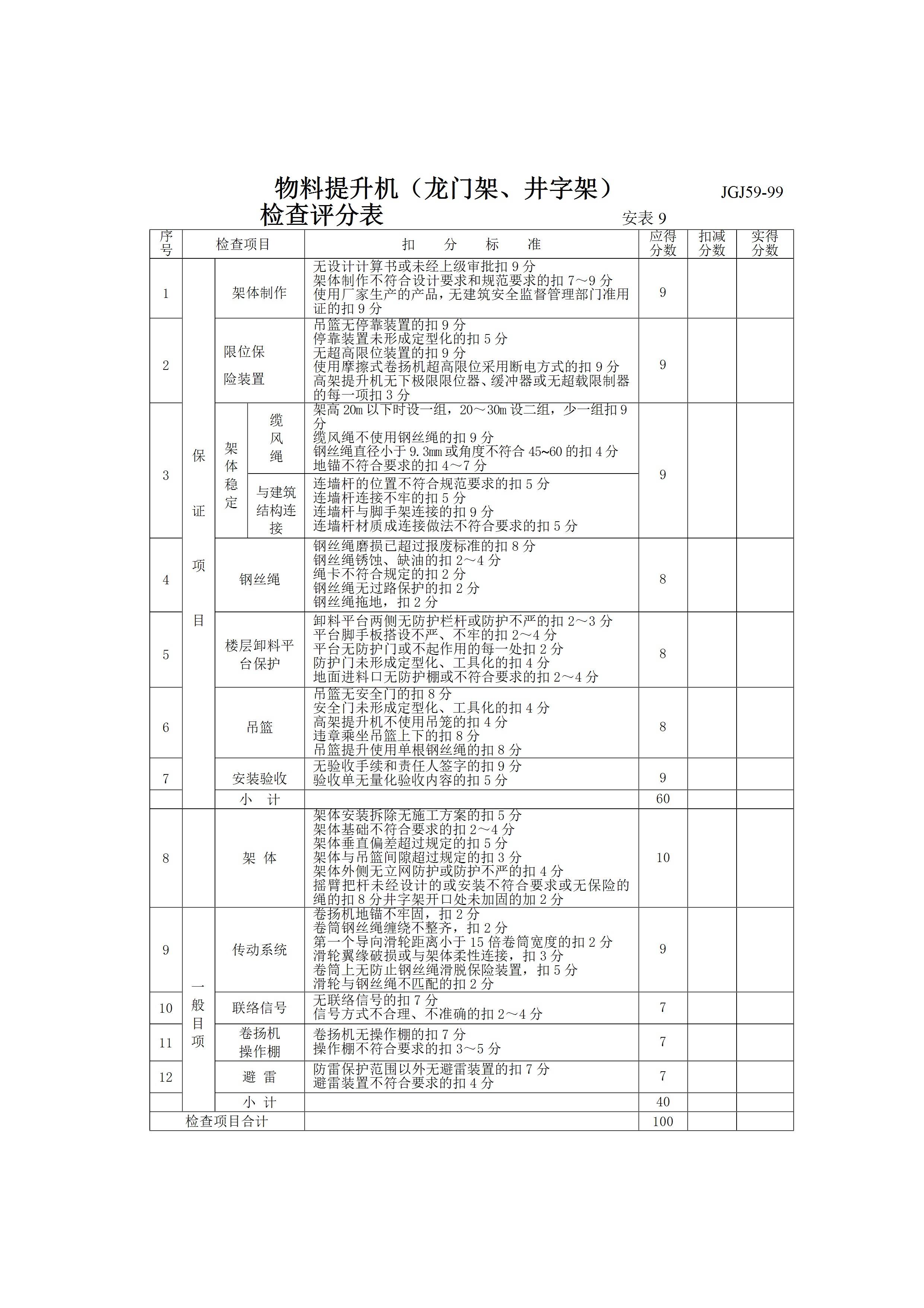 / 物料提升机龙门架,井字架检查评分表[文档]