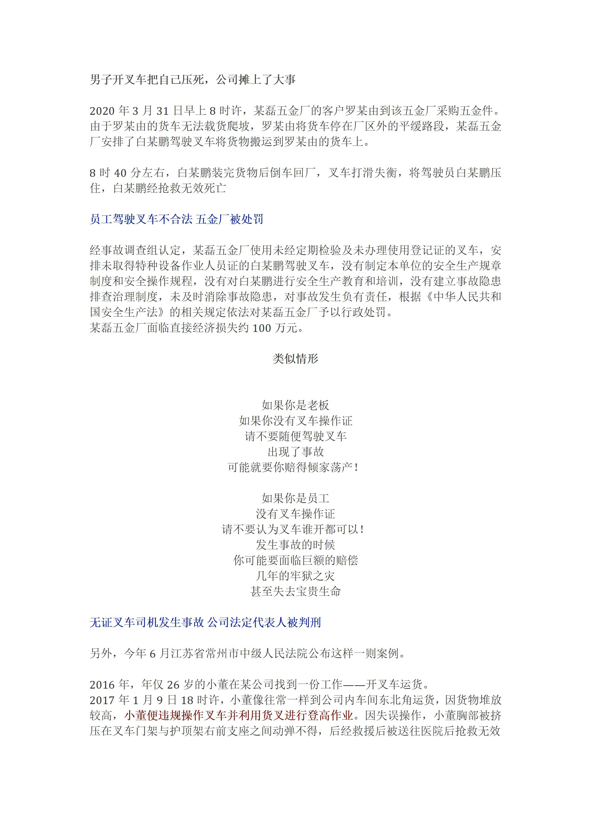 / 通报无证叉车司机发生事故 公司主要负责人被判刑[文档]