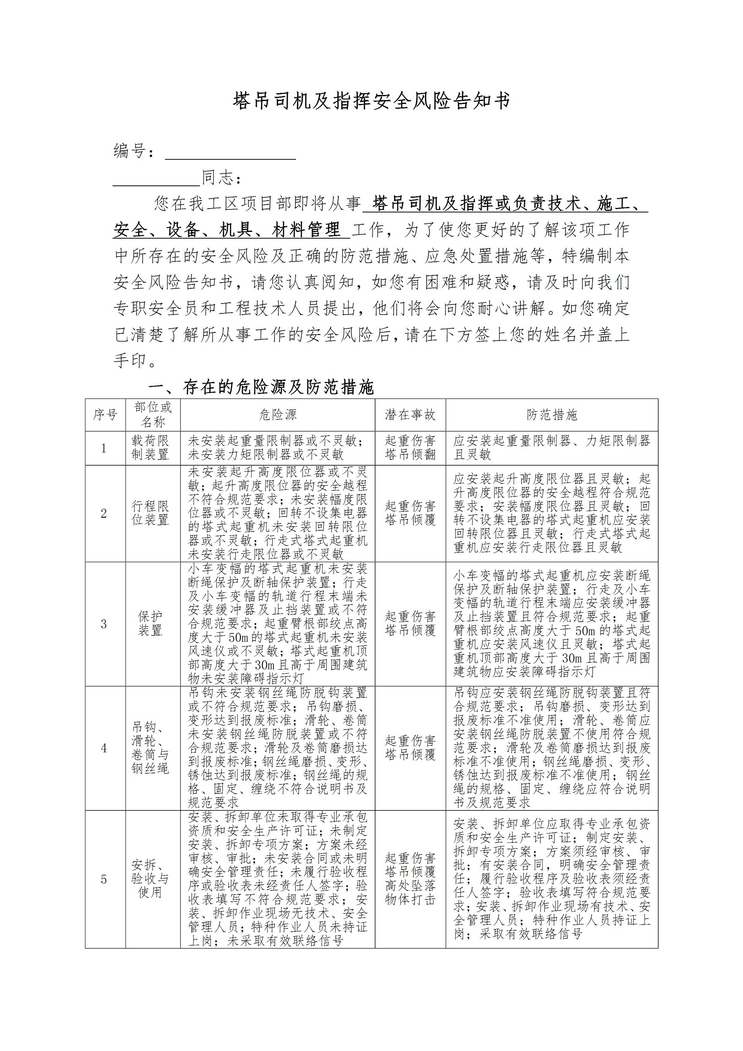 塔吊及指挥安全风险告知书[文档]