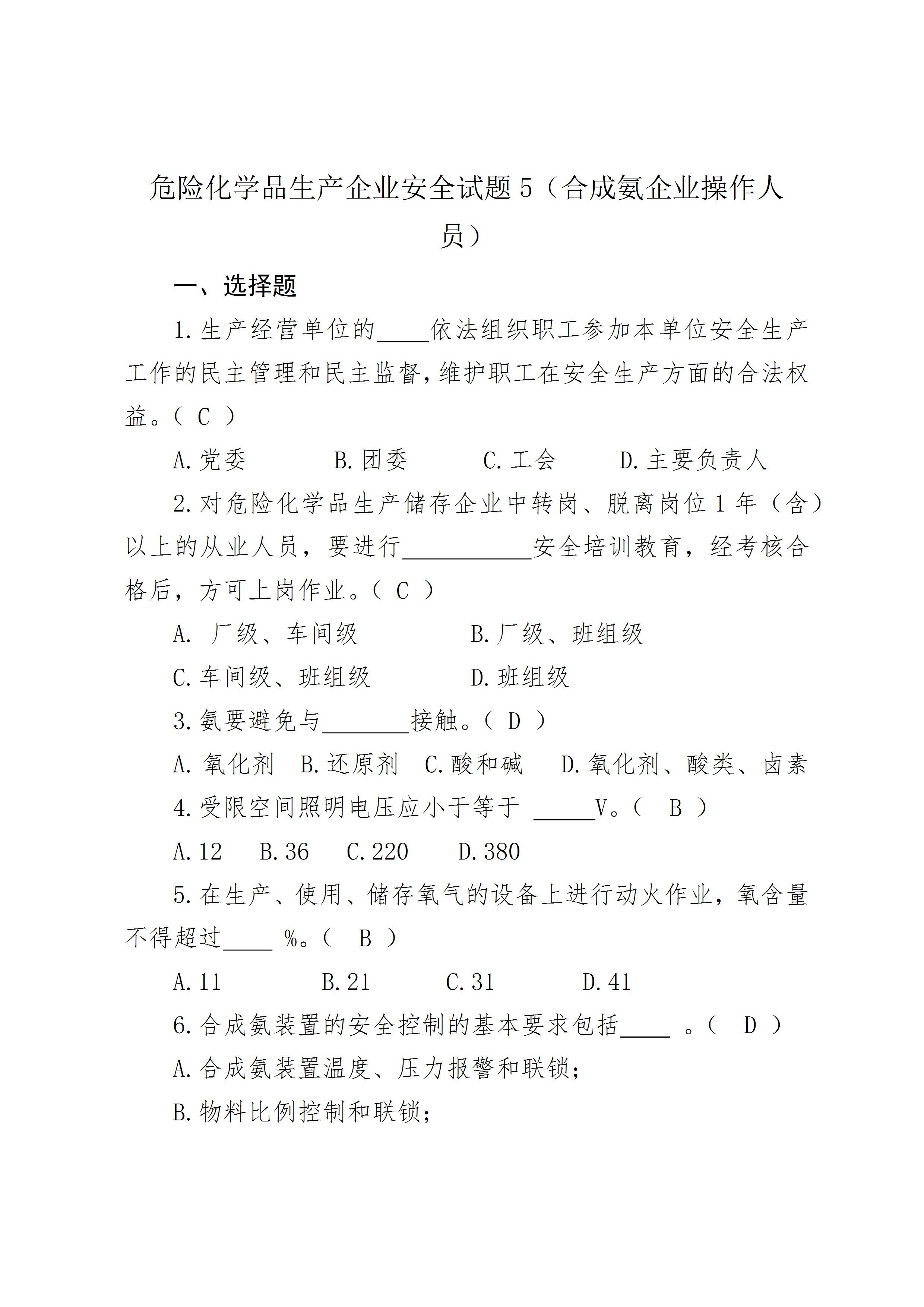 / 危险化学品生产企业安全试题5(合成氨从业人员)