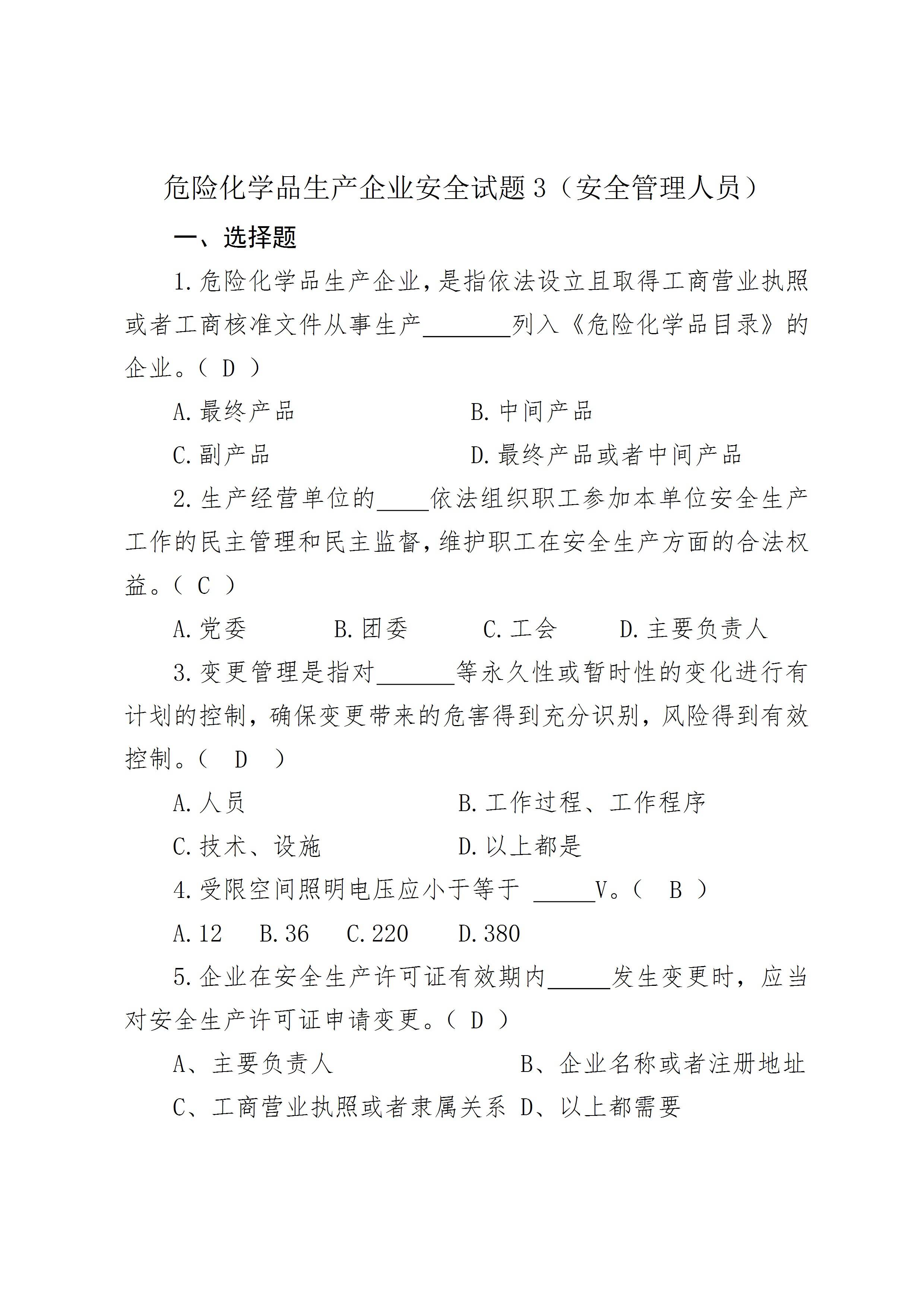 / 危险化学品生产企业安全试题3(安全管理人员)