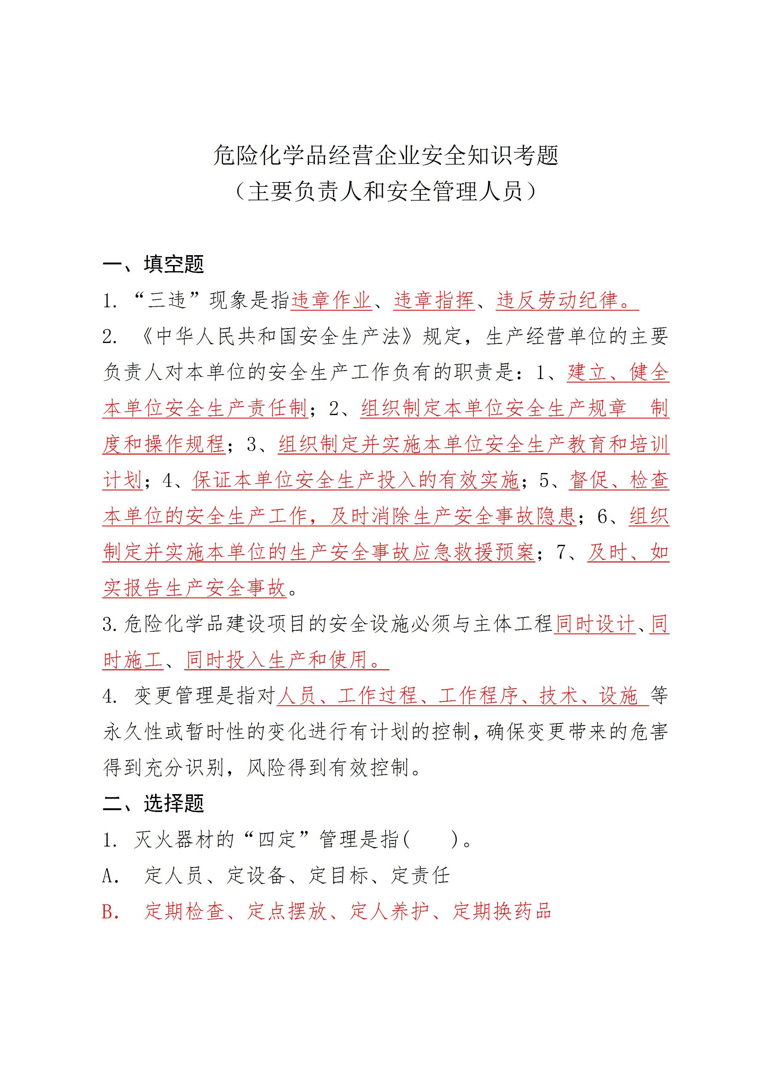 / 危险化学品经营企业安全知识考题(主要负责人、安全管理人员)