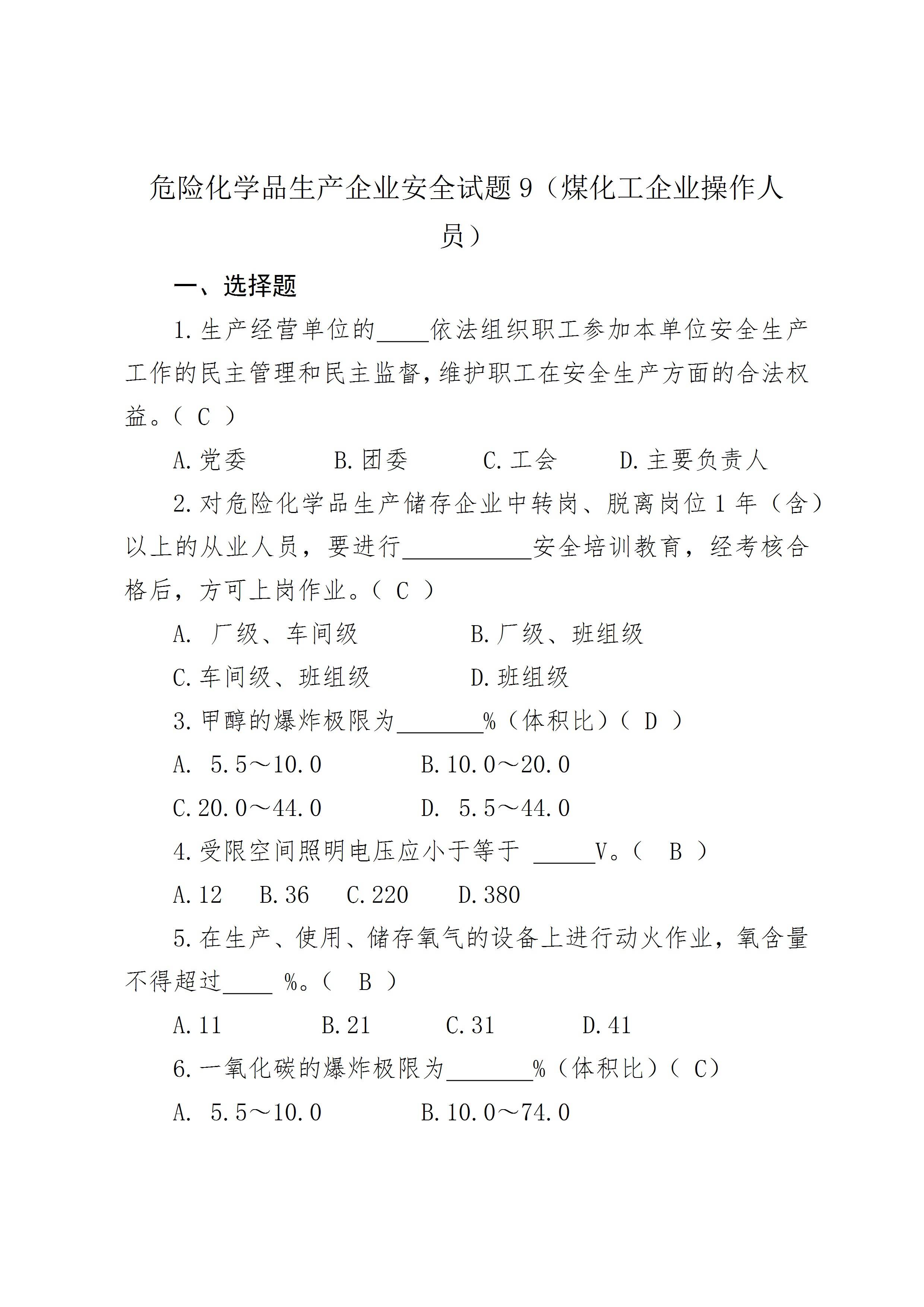 / 危险化学品生产企业安全试题9(煤化工从业人员)