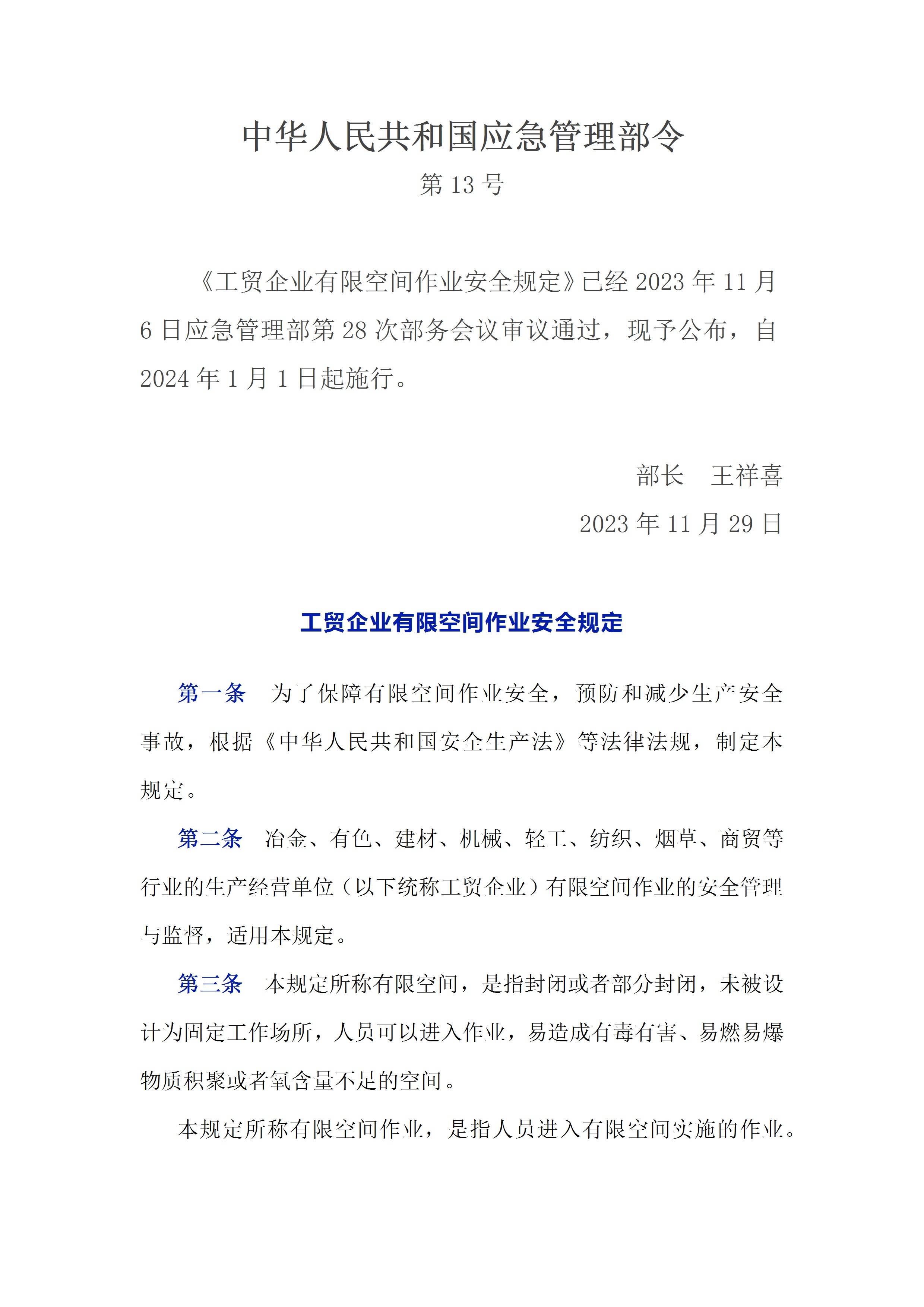 / 【文件】应急管理部令第13号《工贸企业有限空间作业安全规定》