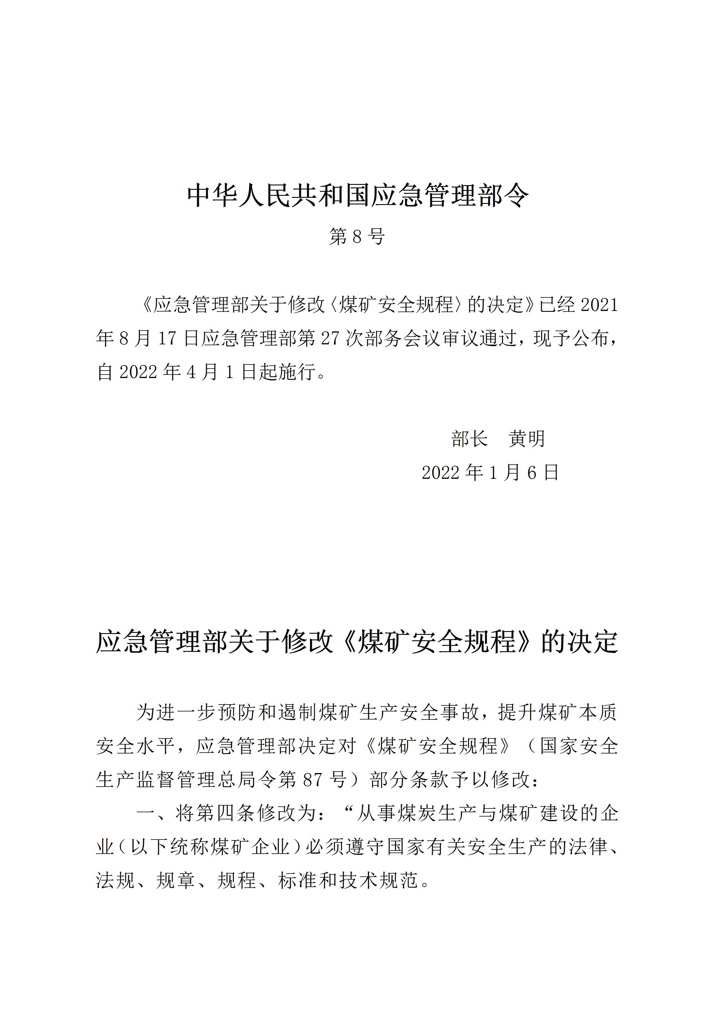 / 应急管理部8号令关于修改《煤矿安全规程》的决定》