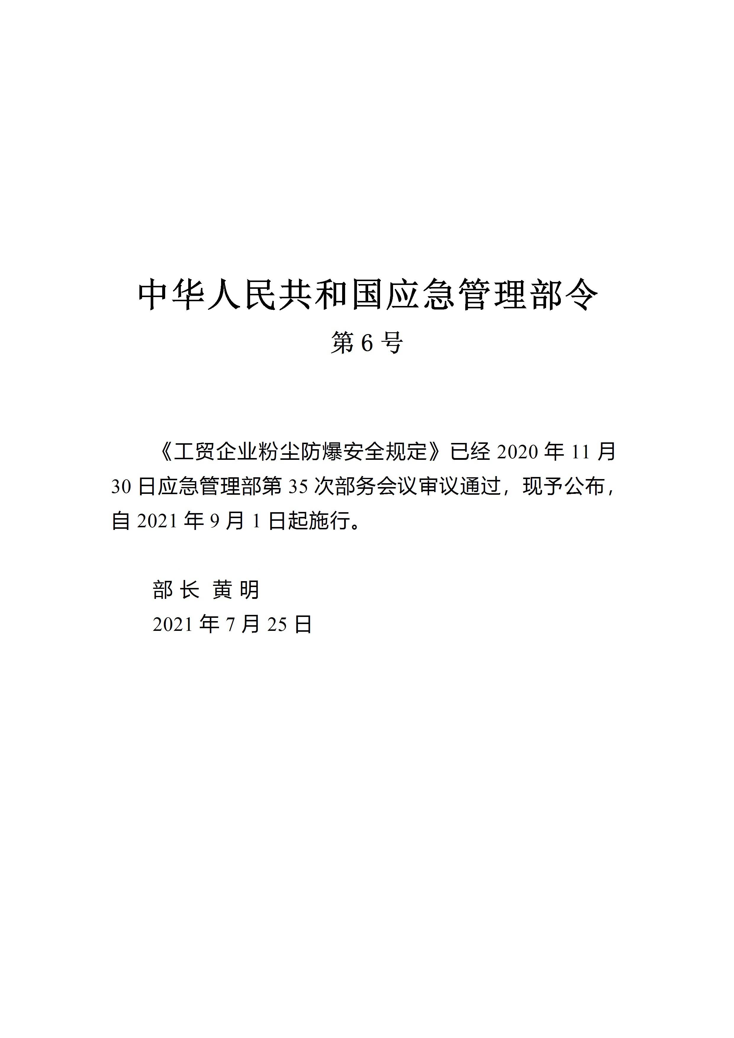 应急管理部6号令《工贸企业粉尘防爆安全规定》