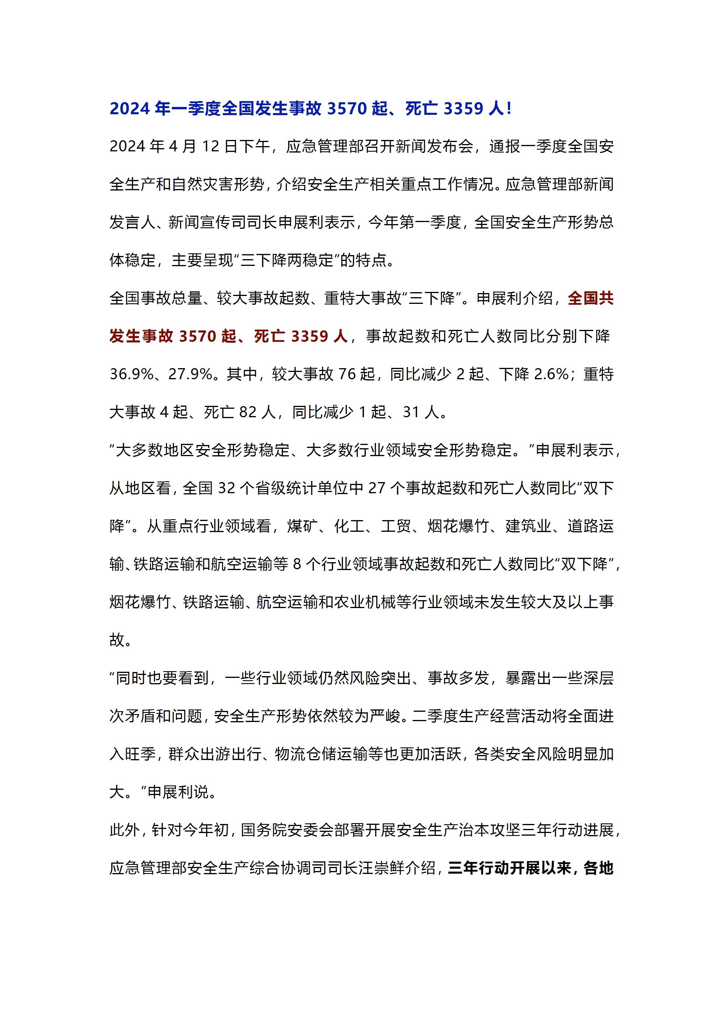 / 应急管理部 2024年一季度全国发生事故3570起 死亡3359人