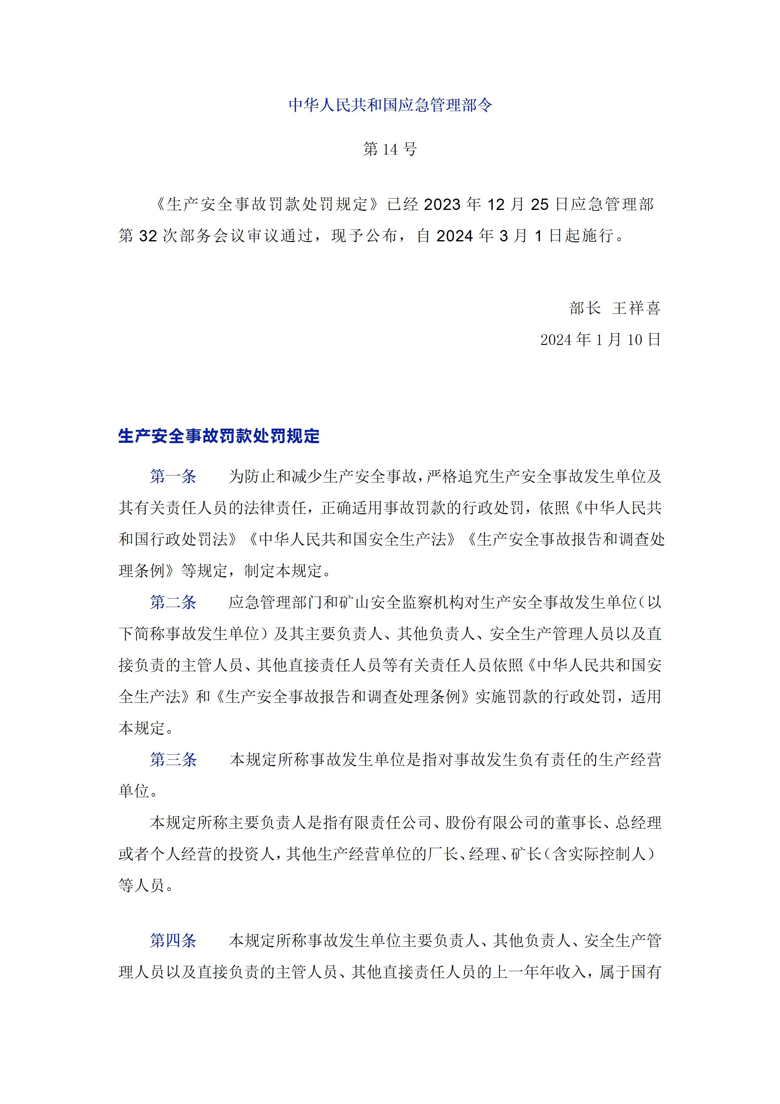 中华人民共和国应急管理部令 第14号《生产安全事故罚款处罚规定》
