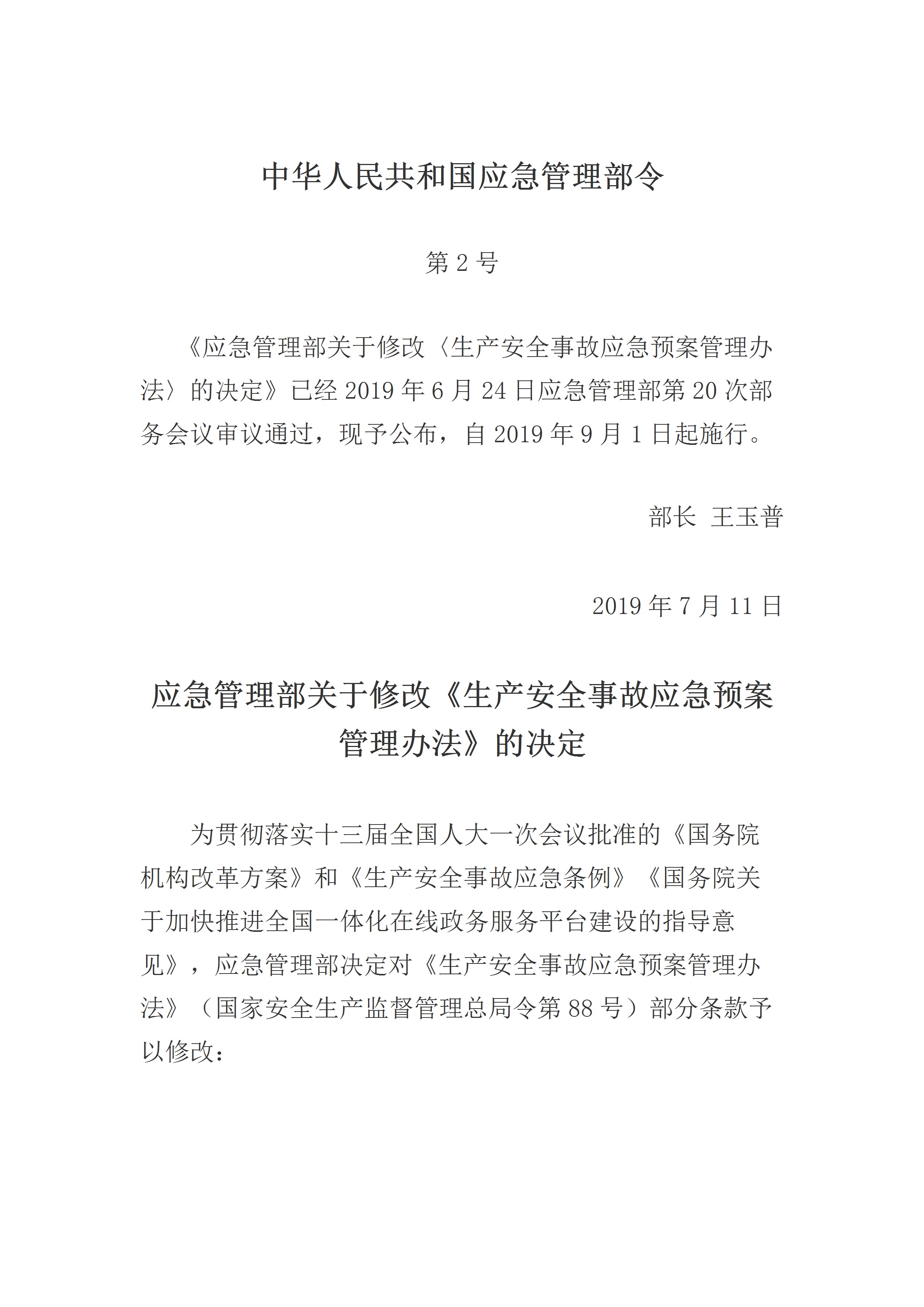 中华人民共和国应急管理部令[2019]第2号应急管理部关于修改《生产安全事故应急预案管理办法》的决定