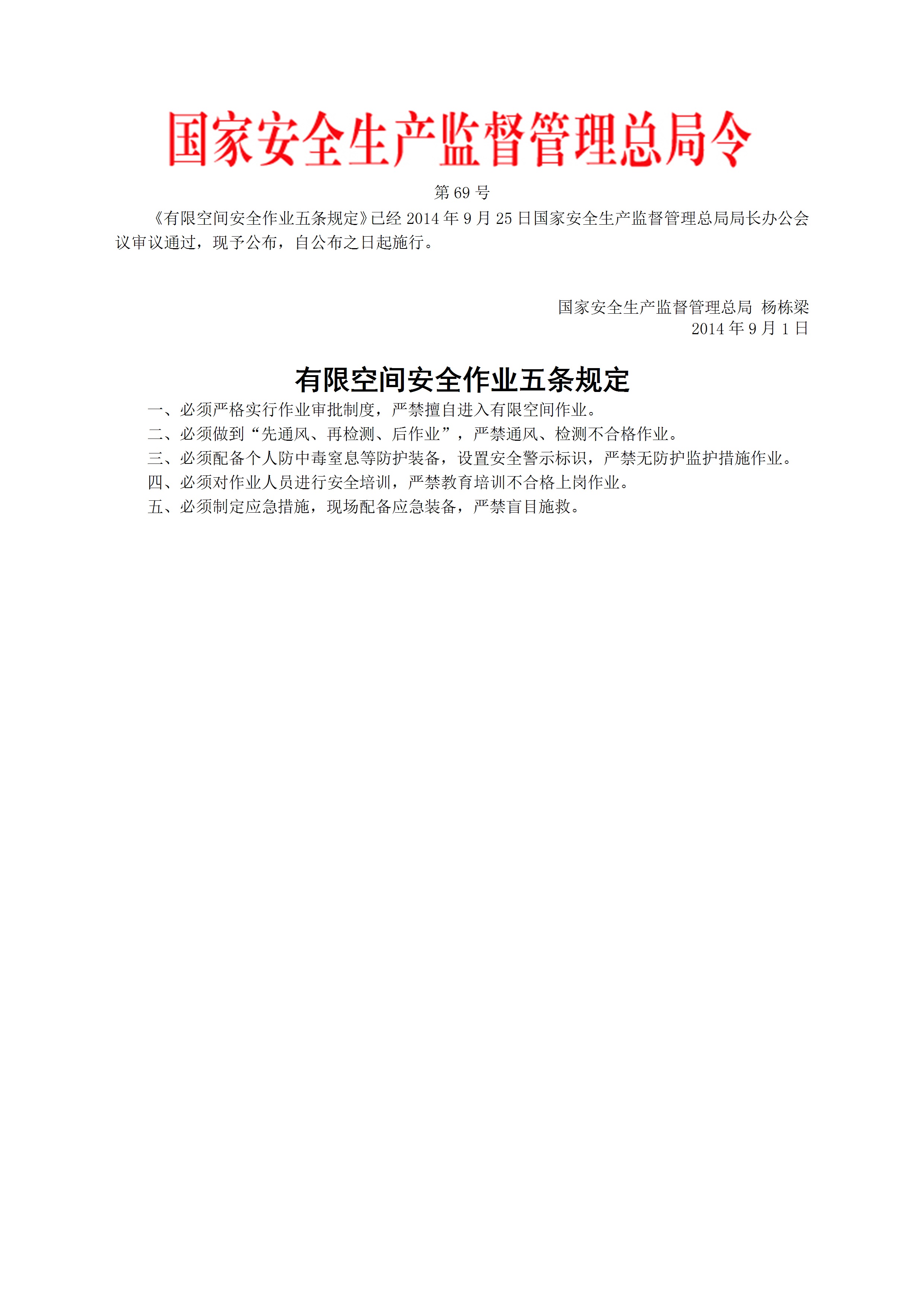 国家安监总局令〔2014〕第69号_有限空间安全作业五条规定(国家安监总局令[2017]第89号废止)