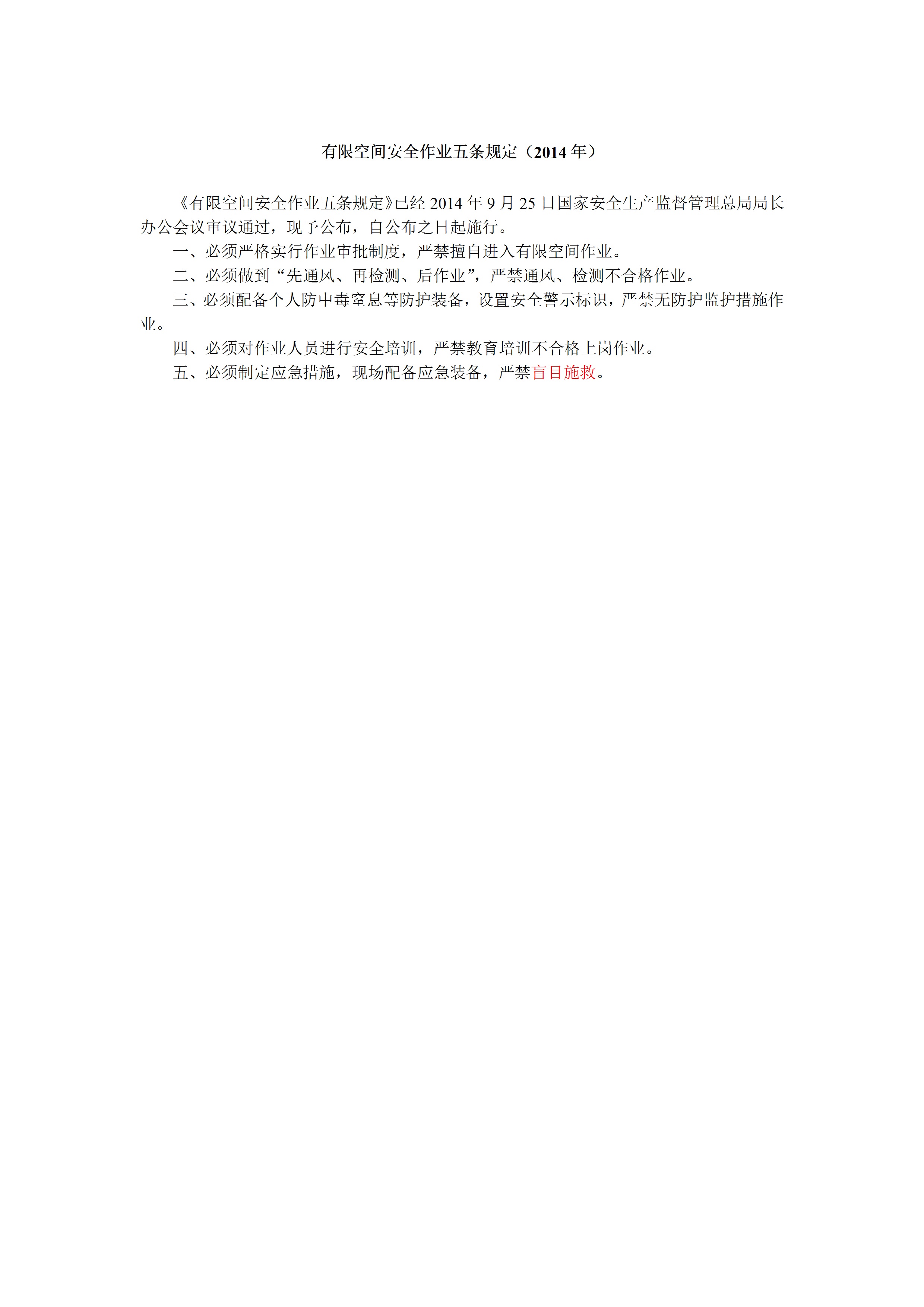 / 有限空间安全作业五条规定(2014年)