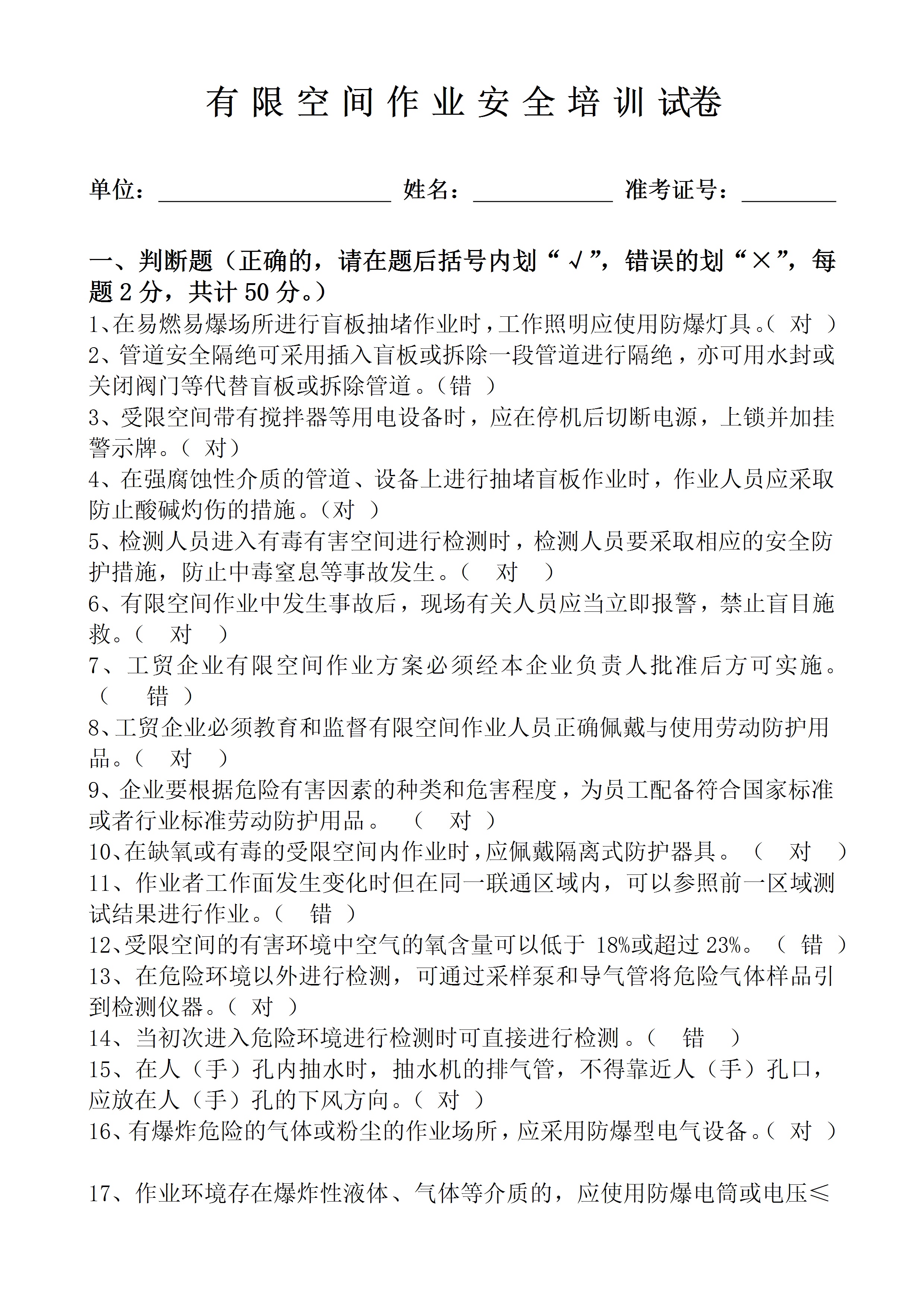 / 有限空间作业安全培训试题