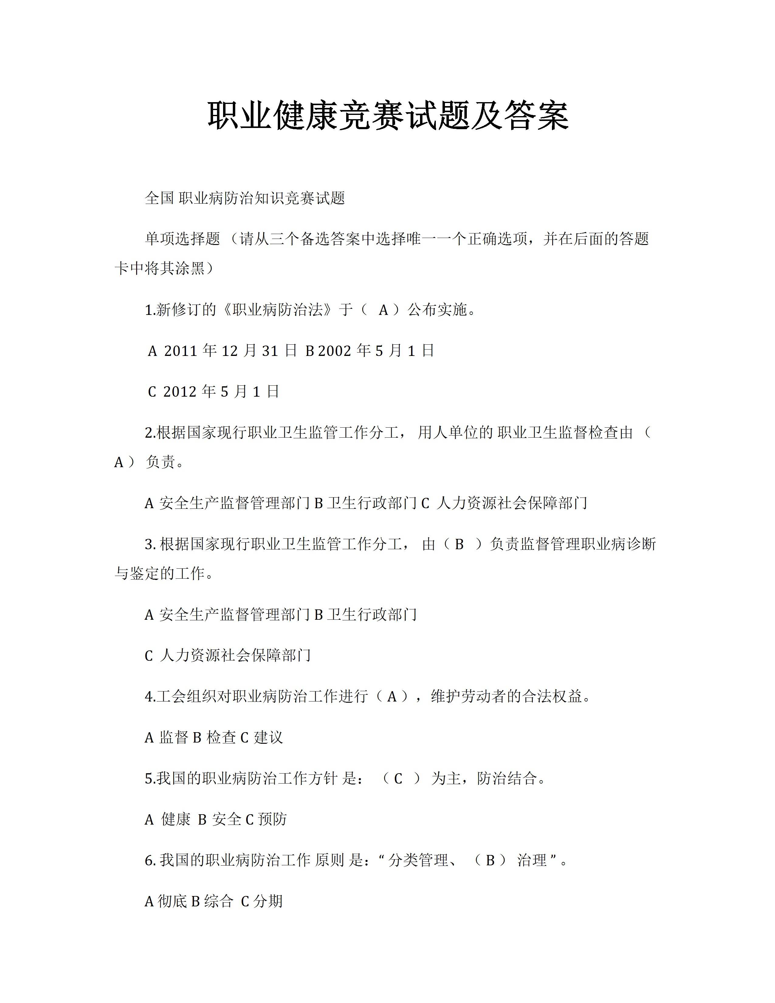 / 职业健康竞赛试题及答案