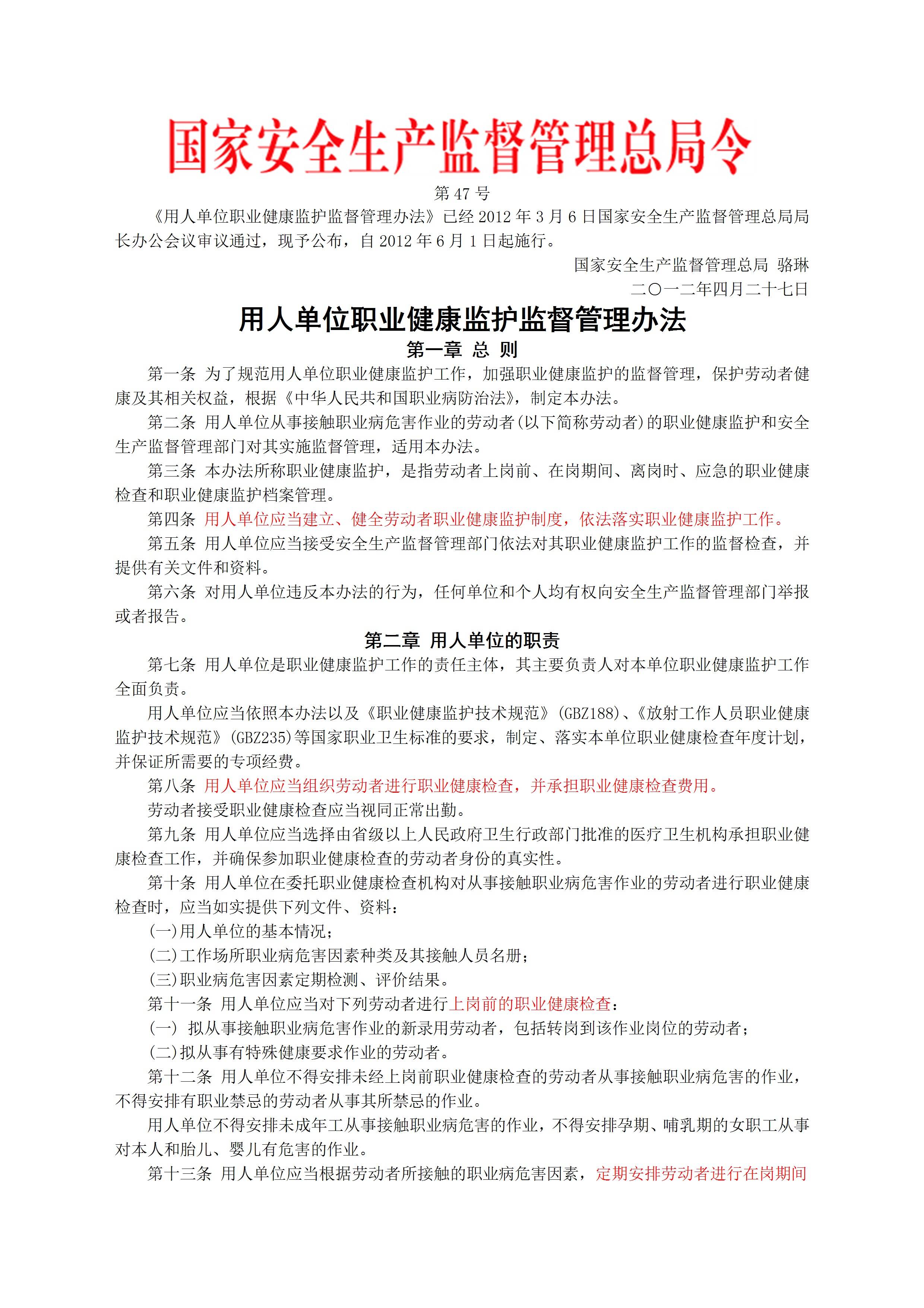 / 安监总局令[2012]第49号_用人单位职业健康监护监督管理办法