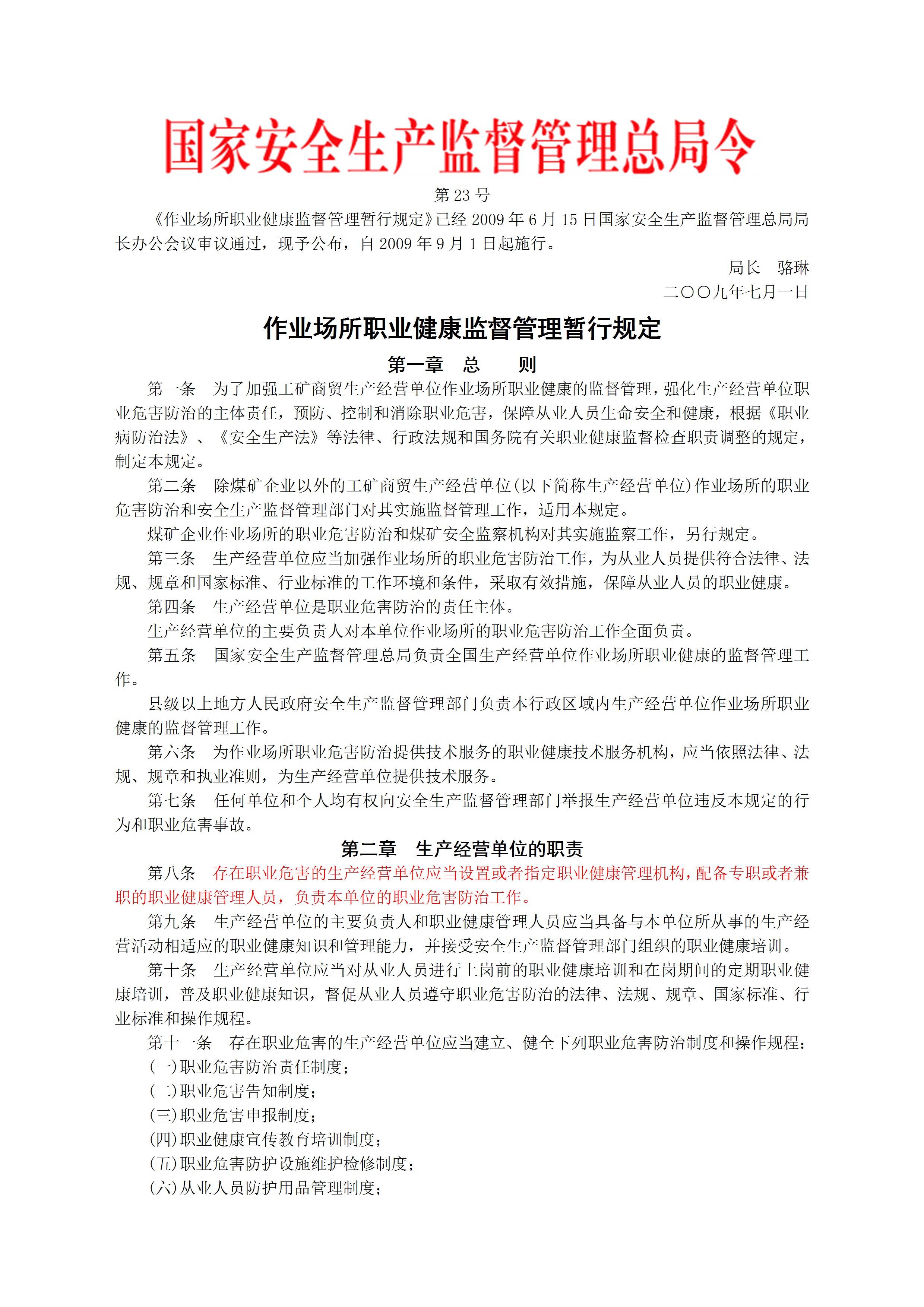 安监总局令[2009]第23号_作业场所职业健康监督管理暂行规定(安监总局令[2012]第47号废止)
