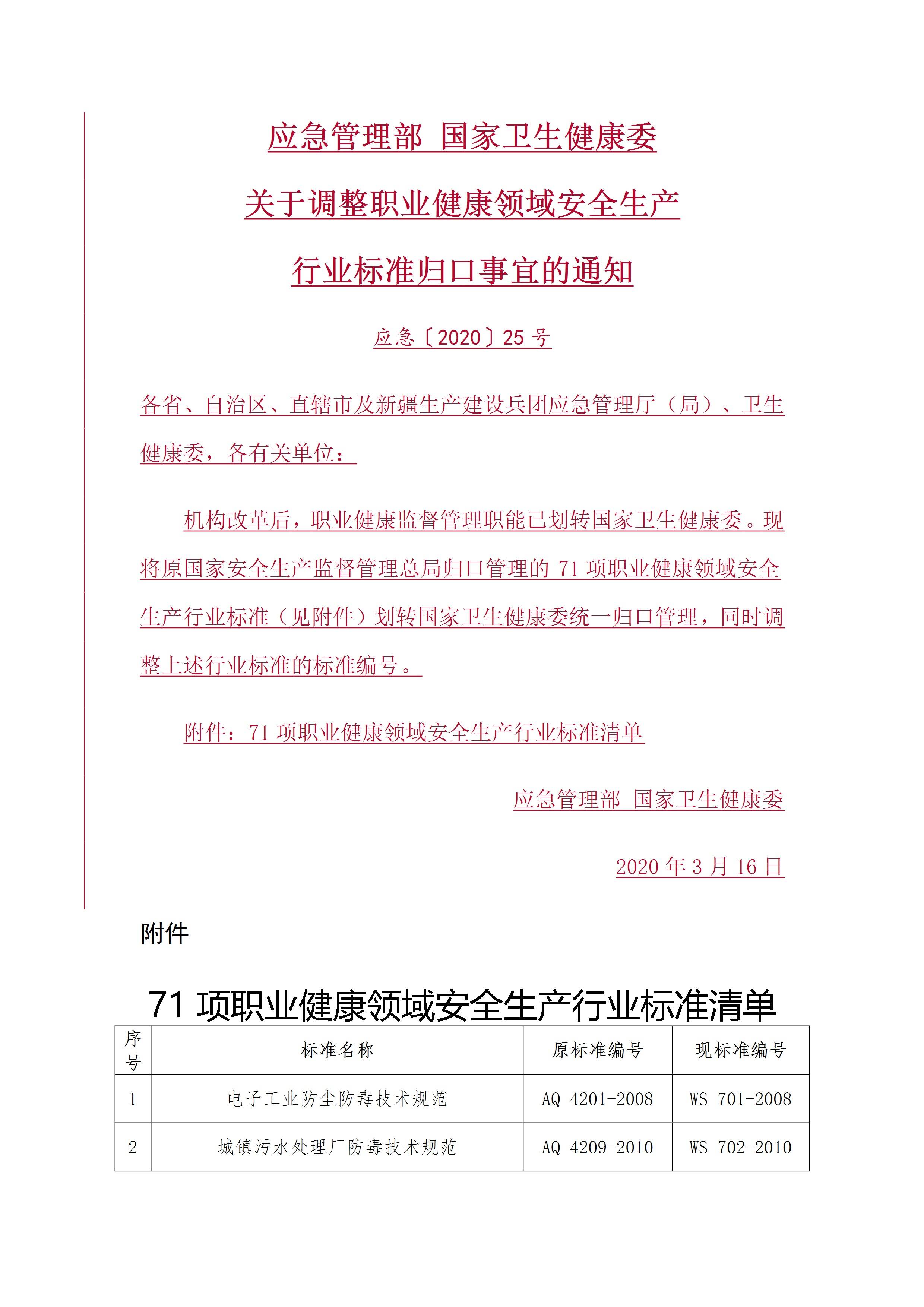 2020年国家卫生健康委关于调整职业健康领域安全生产标准归口的通知