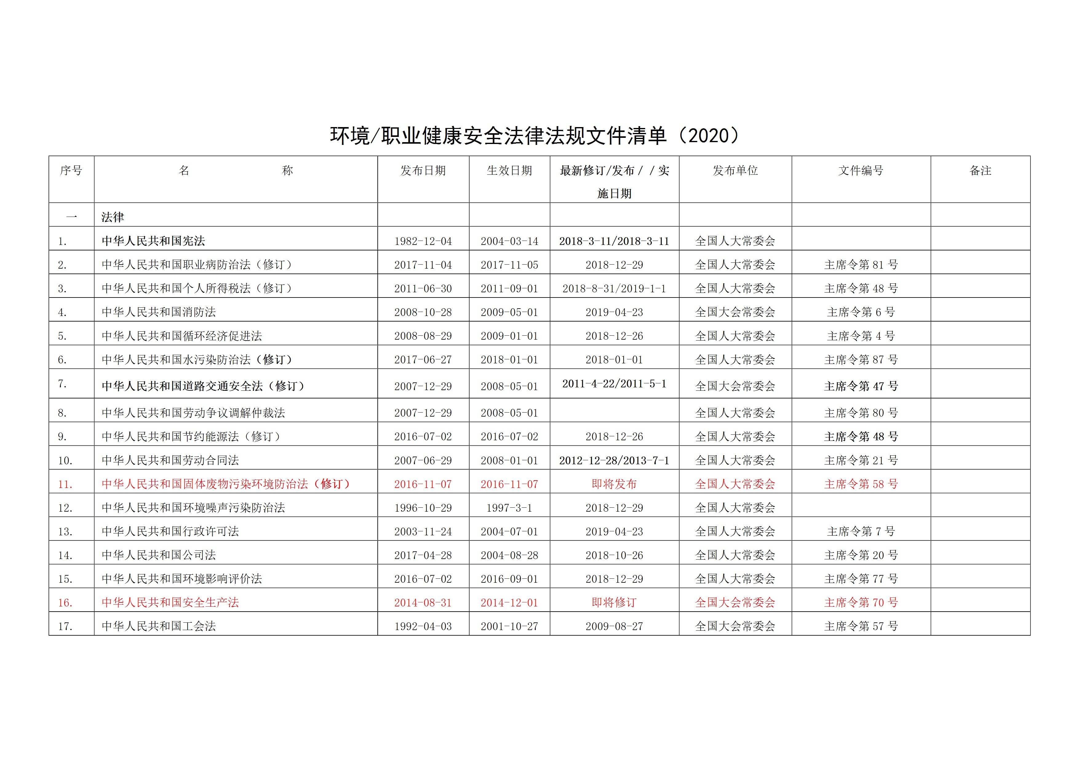 2020环境职业健康安全法律法规文件清单