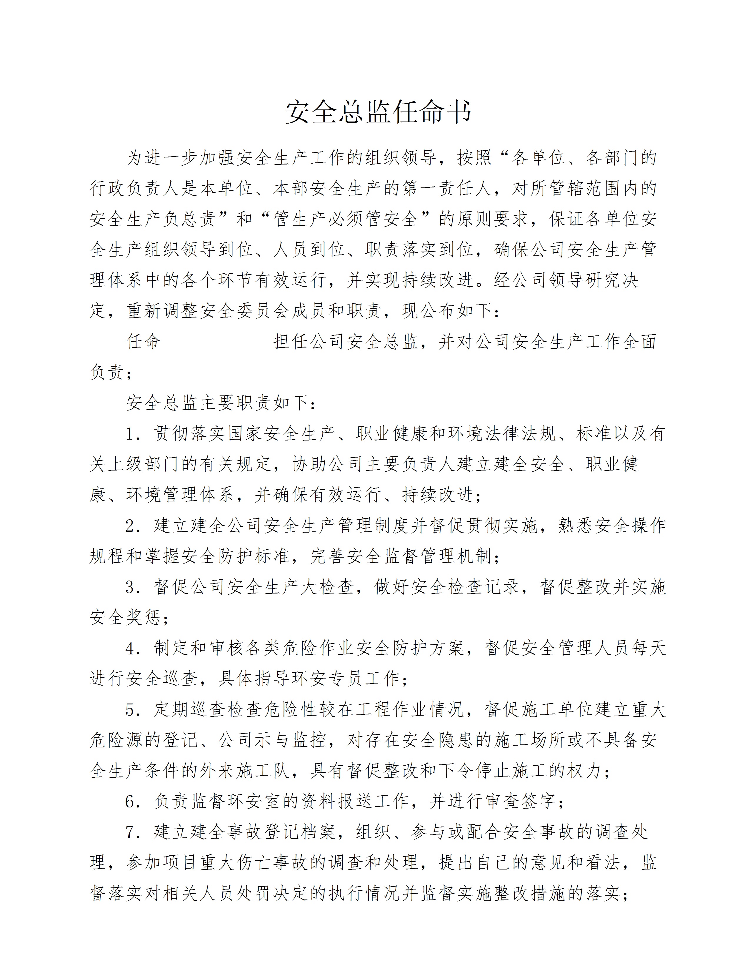 [模板]XX公司安全总监任命书