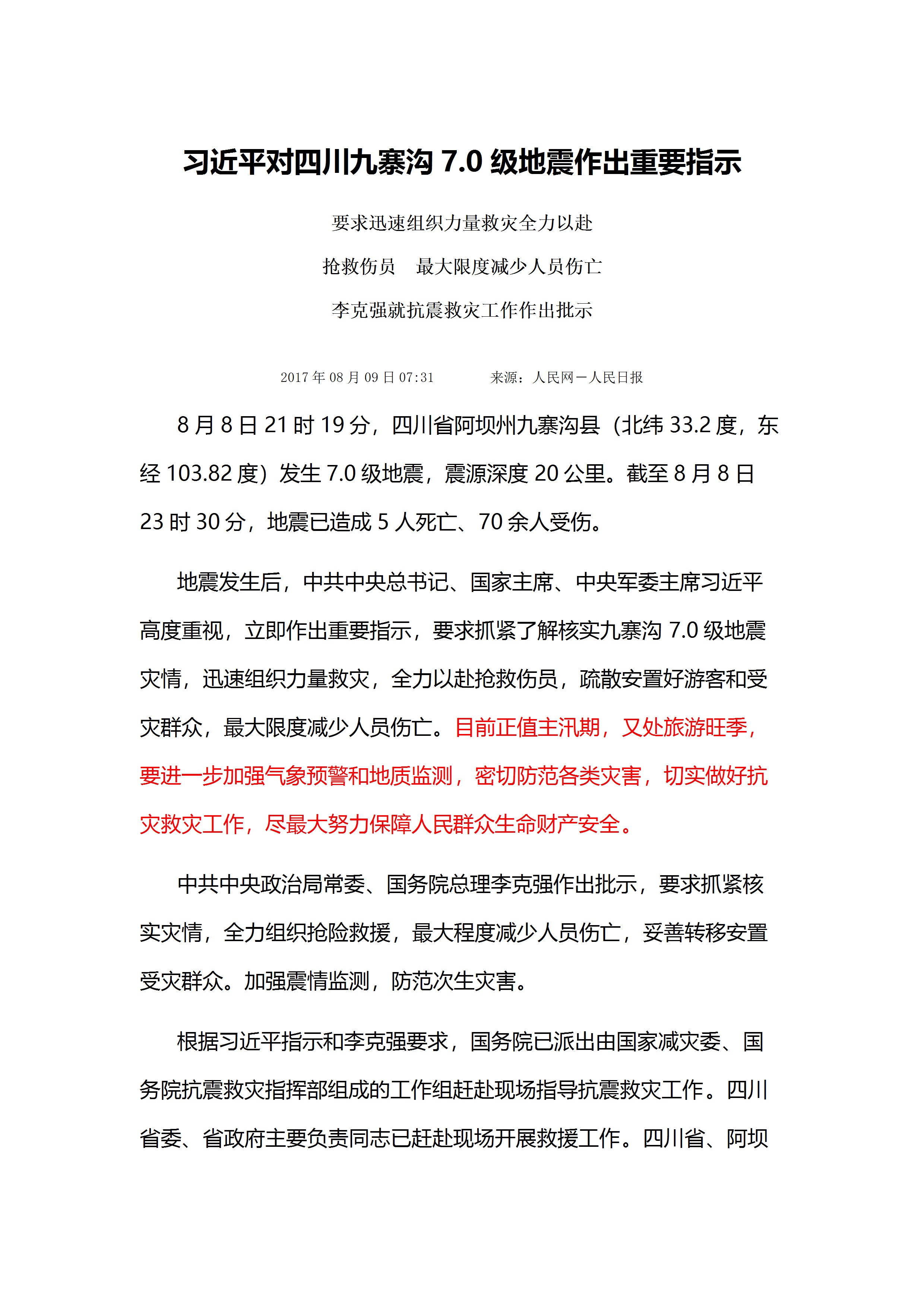 2017年8月对四川九寨沟7.0级地震作出重要指示