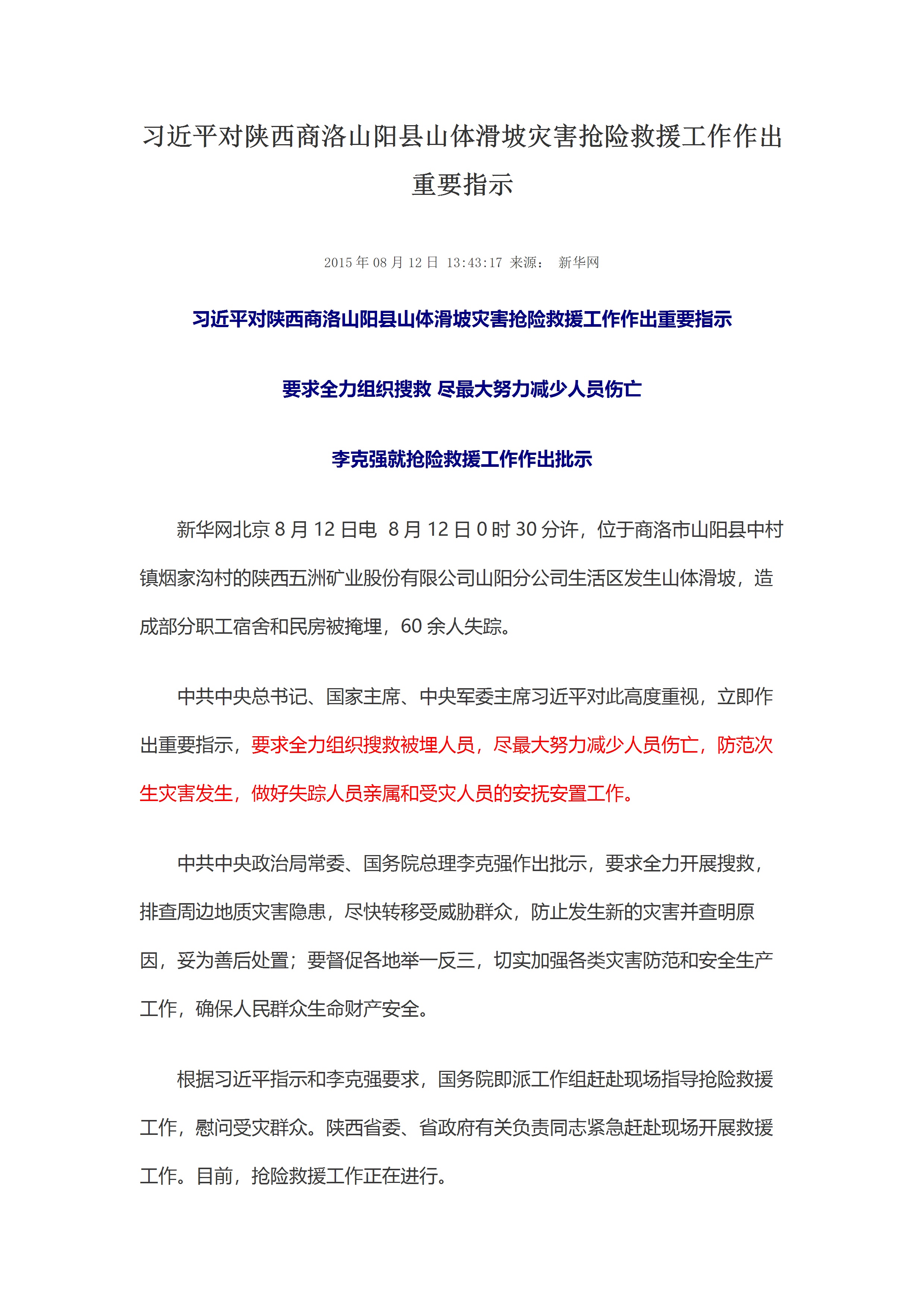 2015年8月习近平对陕西商洛山阳县山体滑坡灾害抢险救援工作作出重要指示