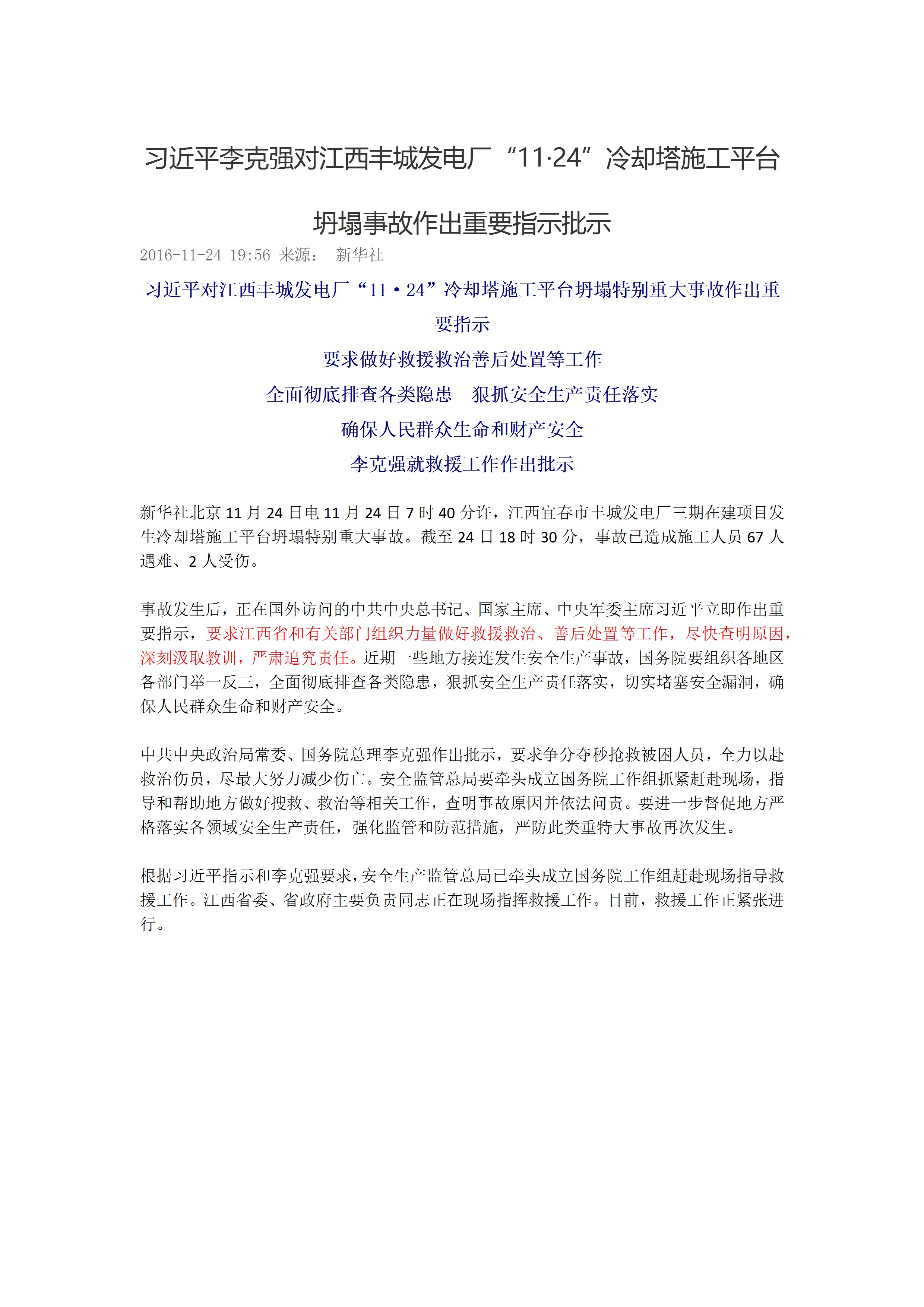 2016年11月24日在江西丰城一电厂在建冷却塔施工平台倒塌事故作出重要指示