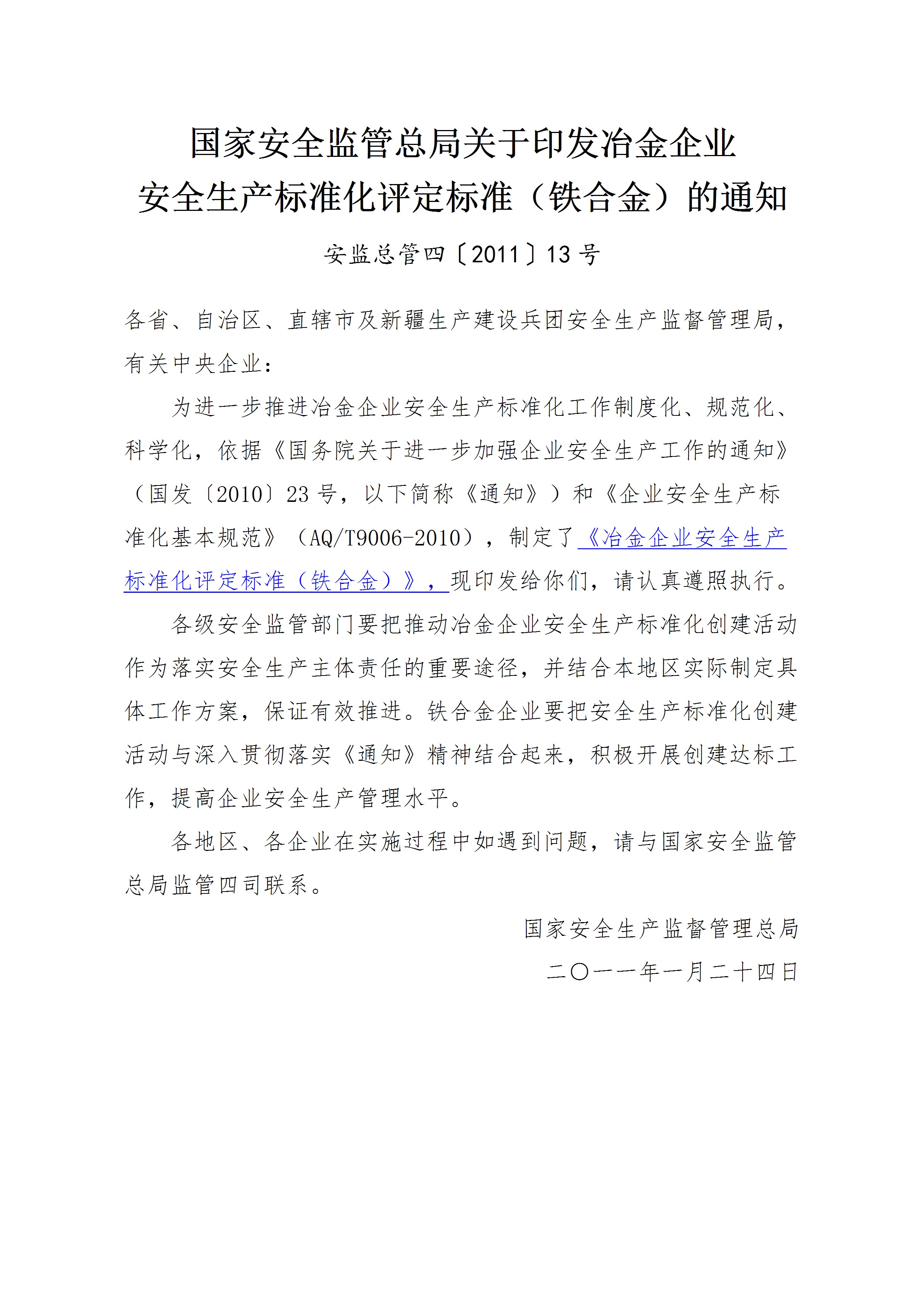 安监总管四〔2011〕13号铁合金国家安全监管总局关于印发冶金企业安全生产标准化评定标准铁合金的通知