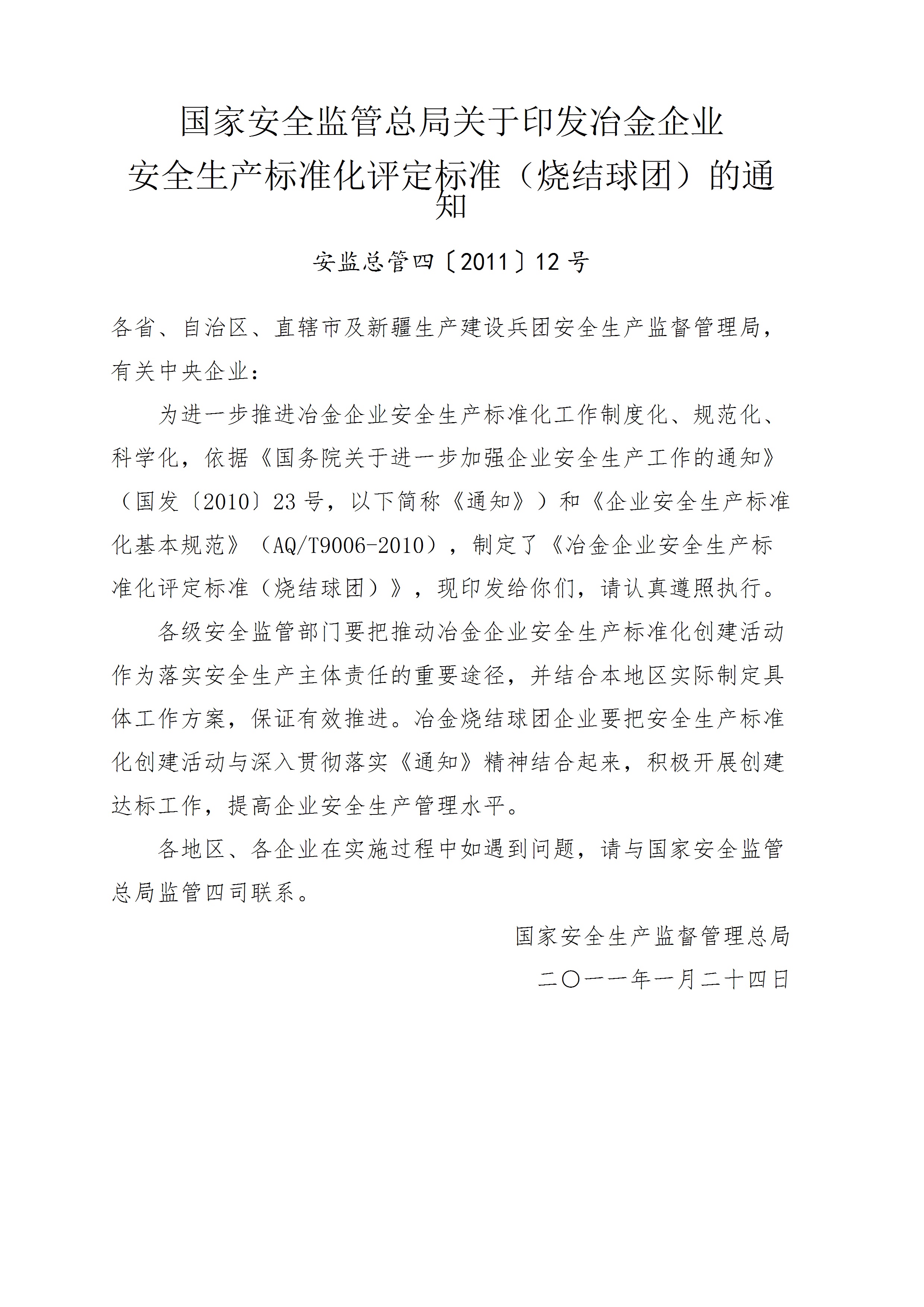 安监总管四〔2011〕12号烧结球团国家安全监管总局关于印发冶金企业安全生产标准化评定标准烧结球团的通知