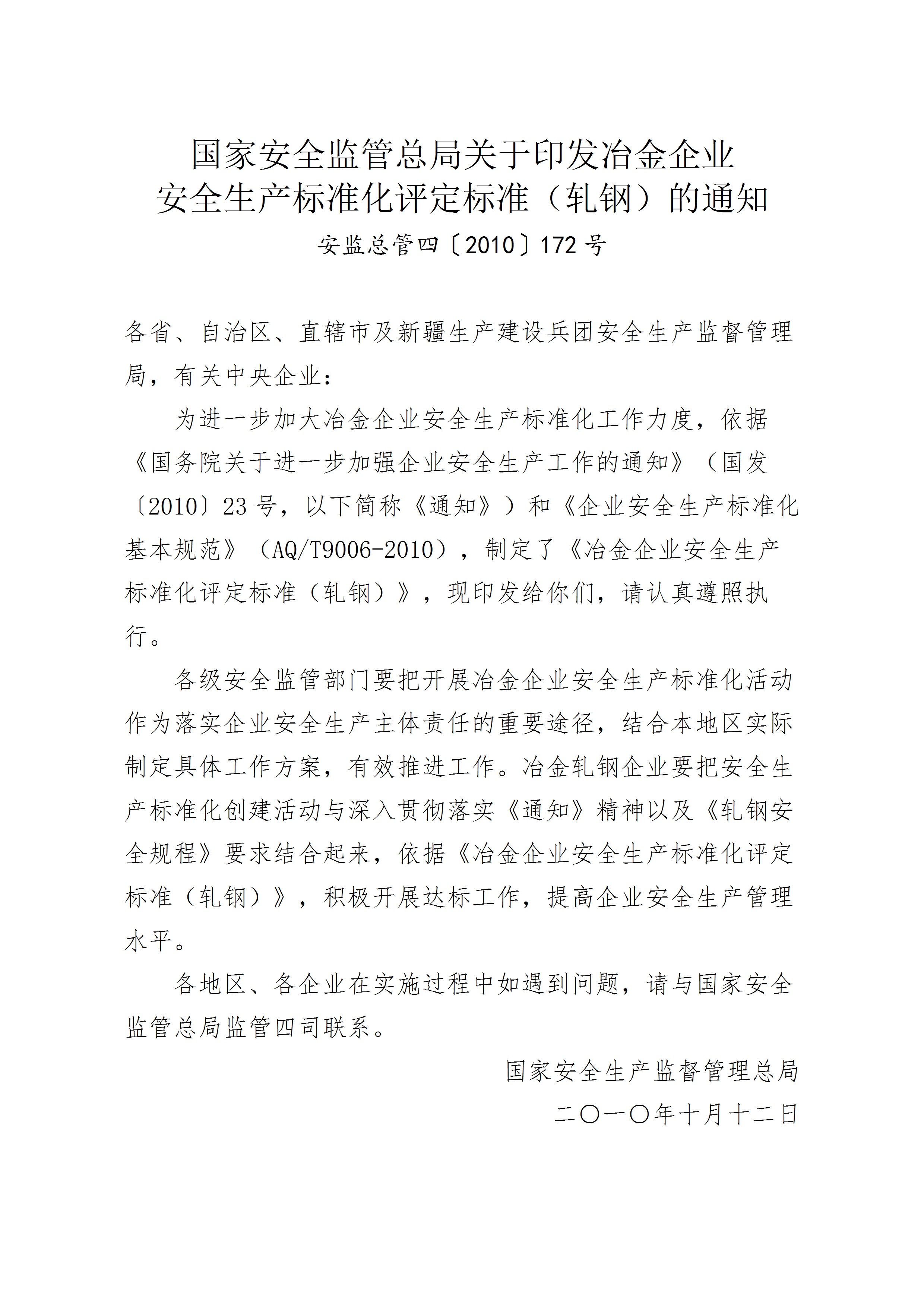 安监总管四〔2010〕172号轧钢国家安全监管总局关于印发冶金企业安全生产标准化评定标准轧钢的通知