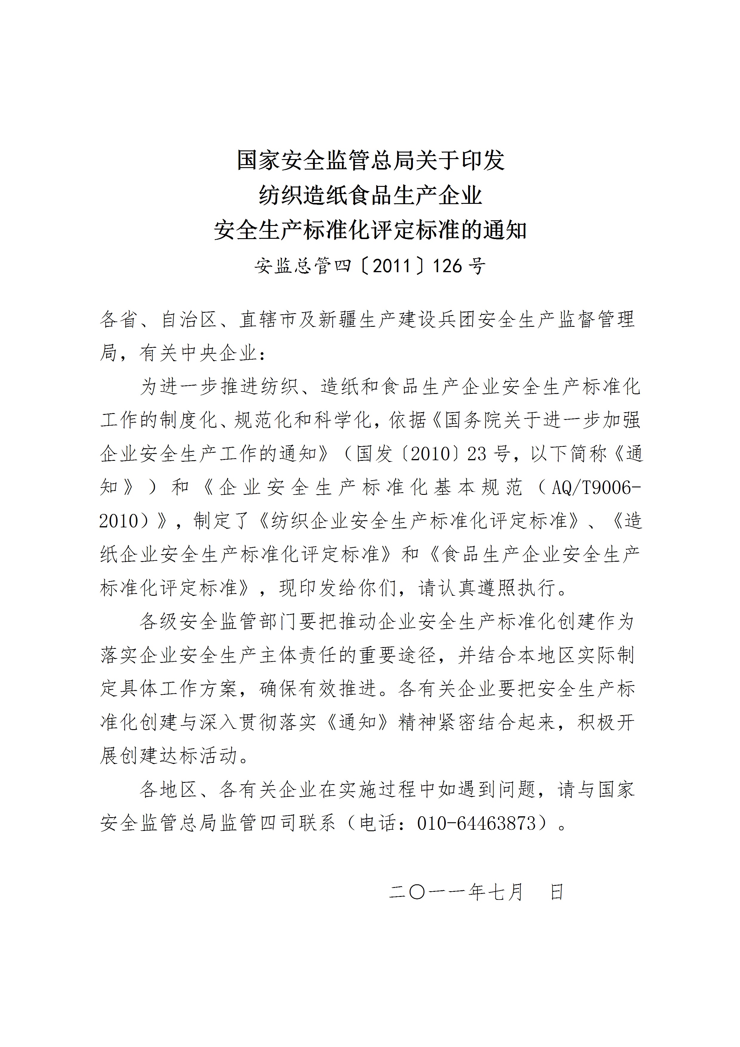 安监总管四〔2011〕126号纺织,造纸,食品国家安全监管总局关于印发纺织造纸食品生产企业安全生产标准化评定标准的通知