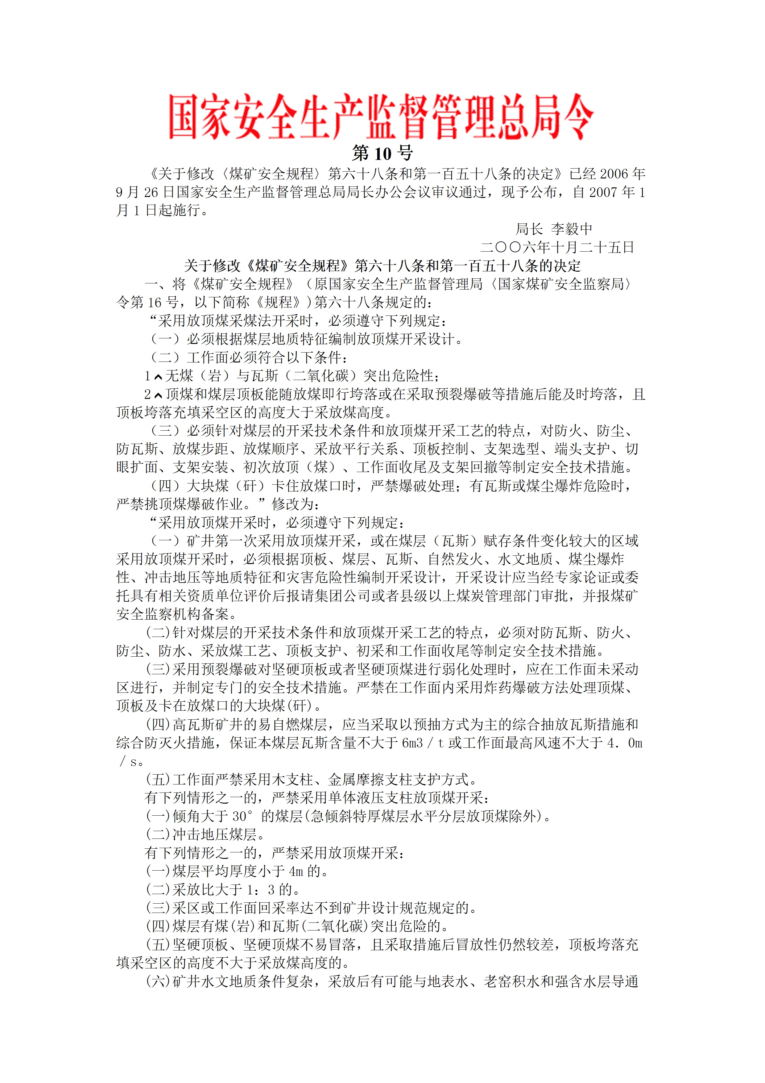 安监总局令[2006]第10号_关于修改〈煤矿安全规程〉第六十八条和第一百五十八条的决定