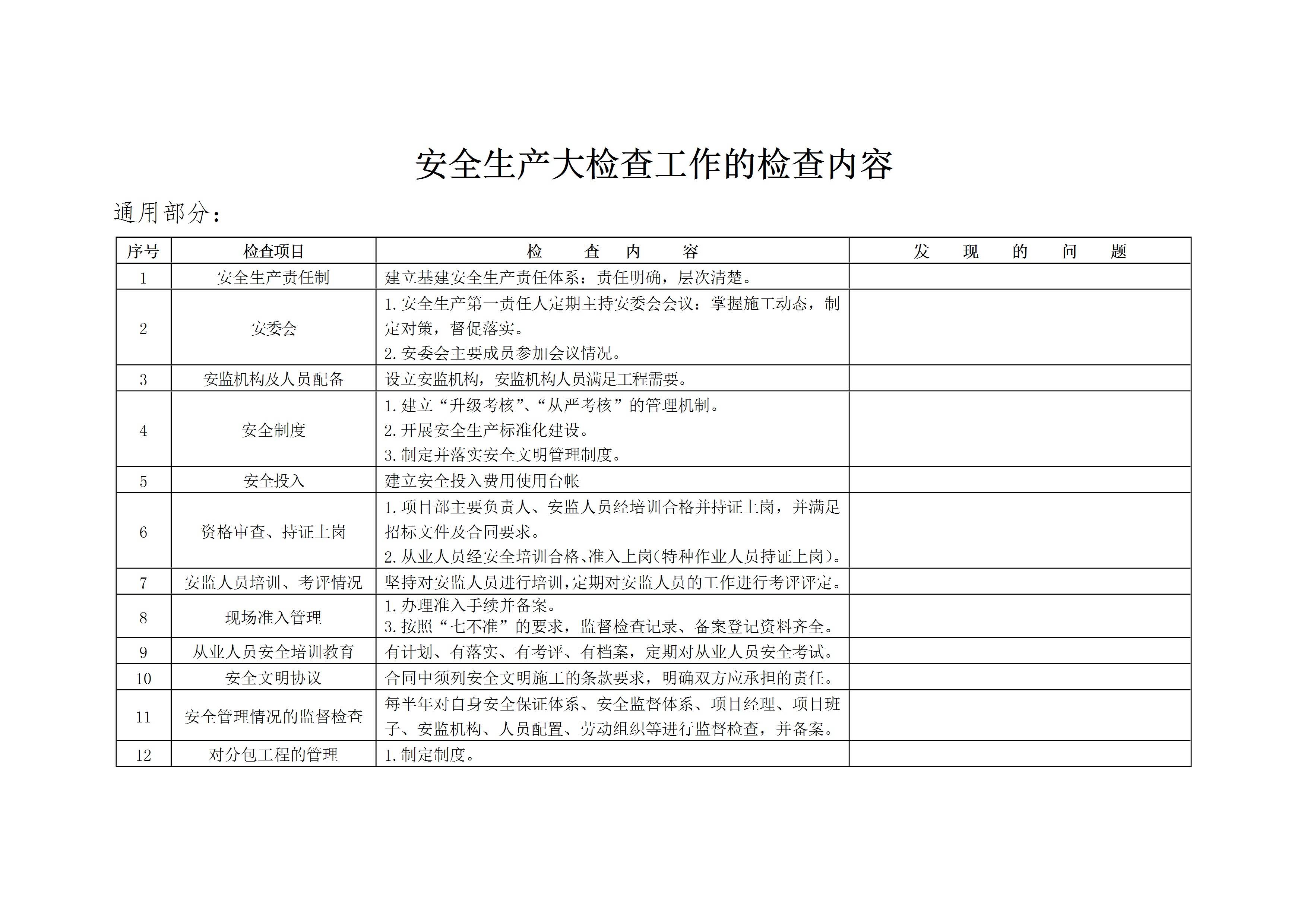 / 安全生产大检查工作检查内容