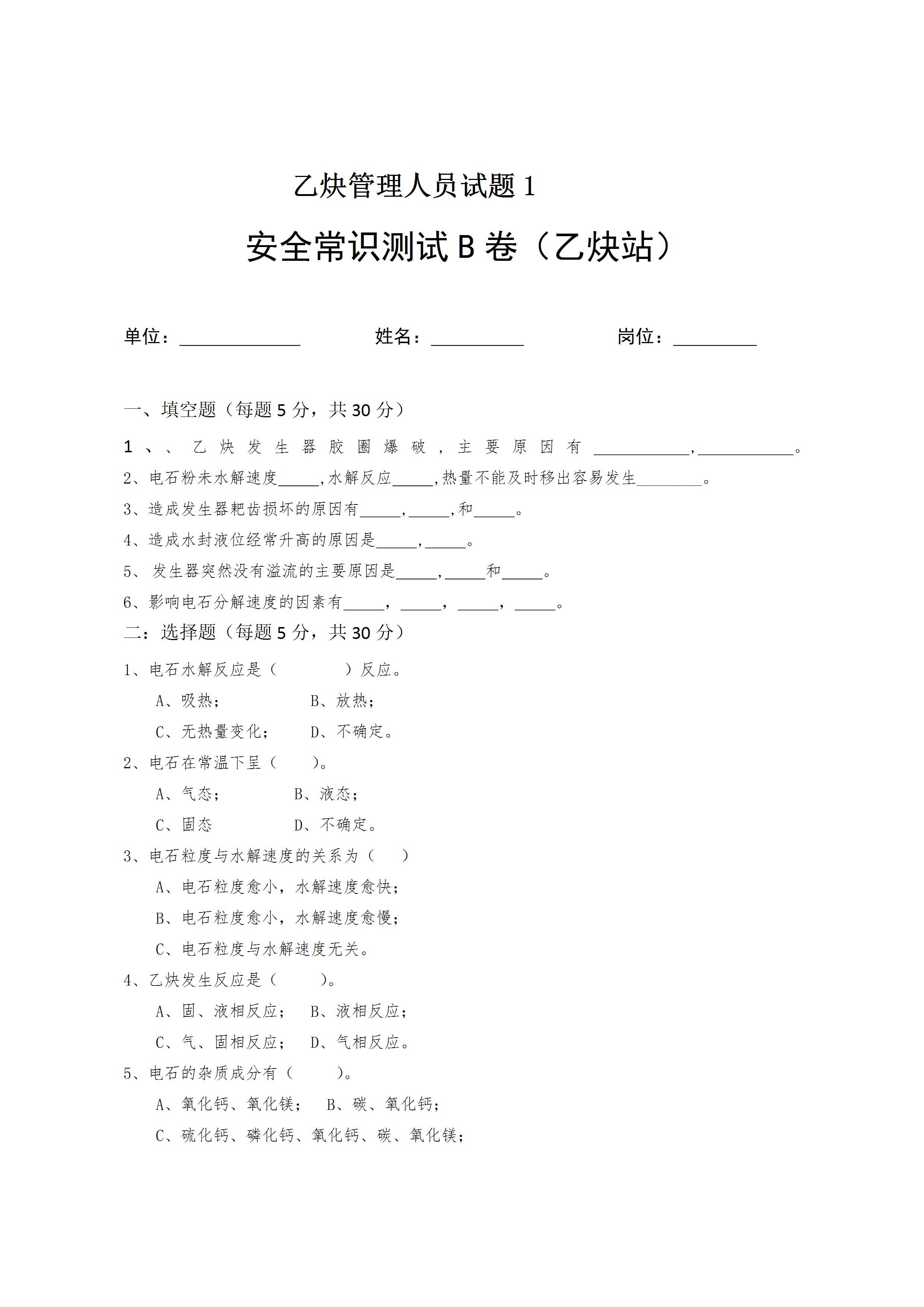 安全常识测试B卷乙炔站
