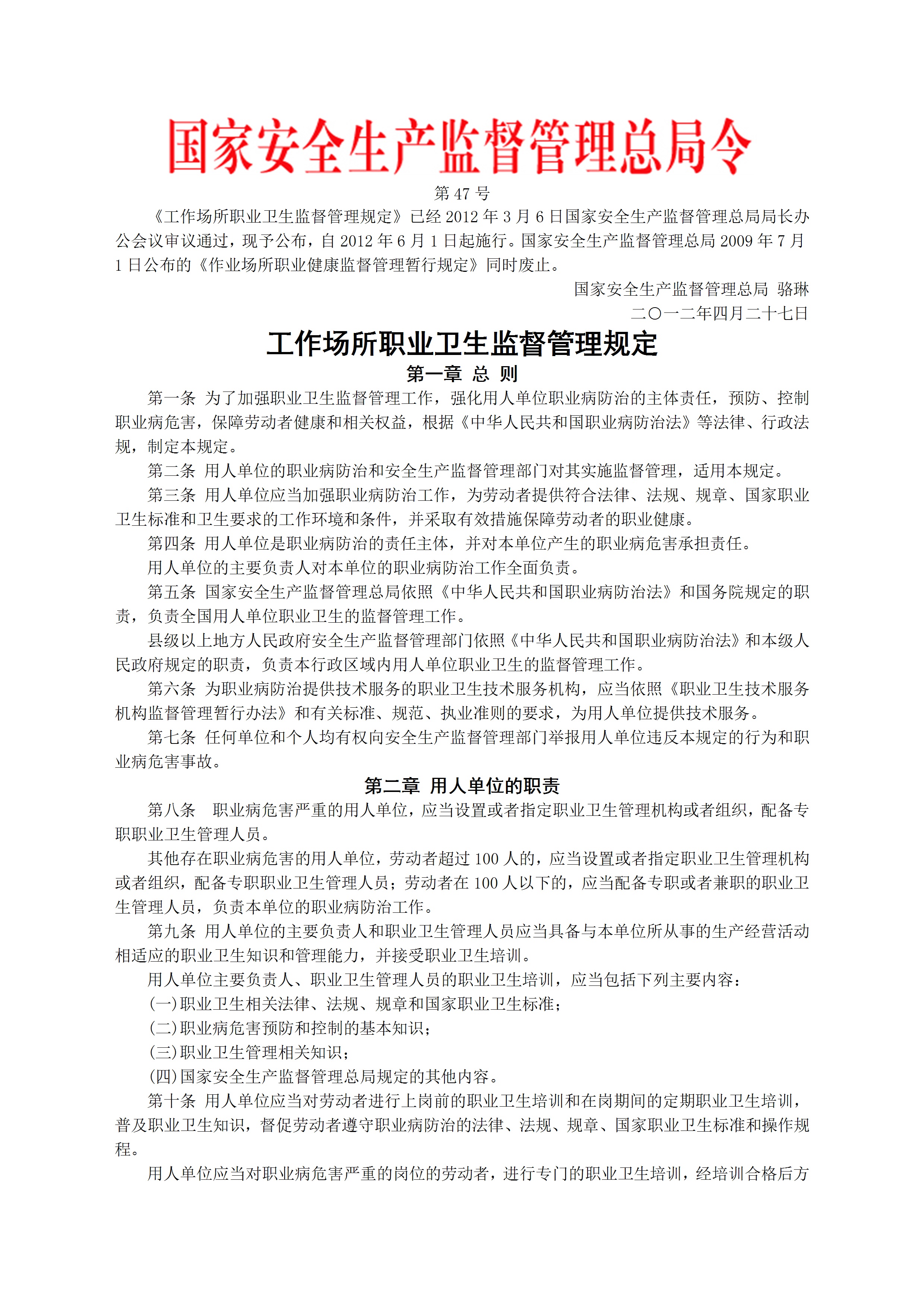 / 安监总局令[22]第47号_工作场所职业卫生监督管理规定