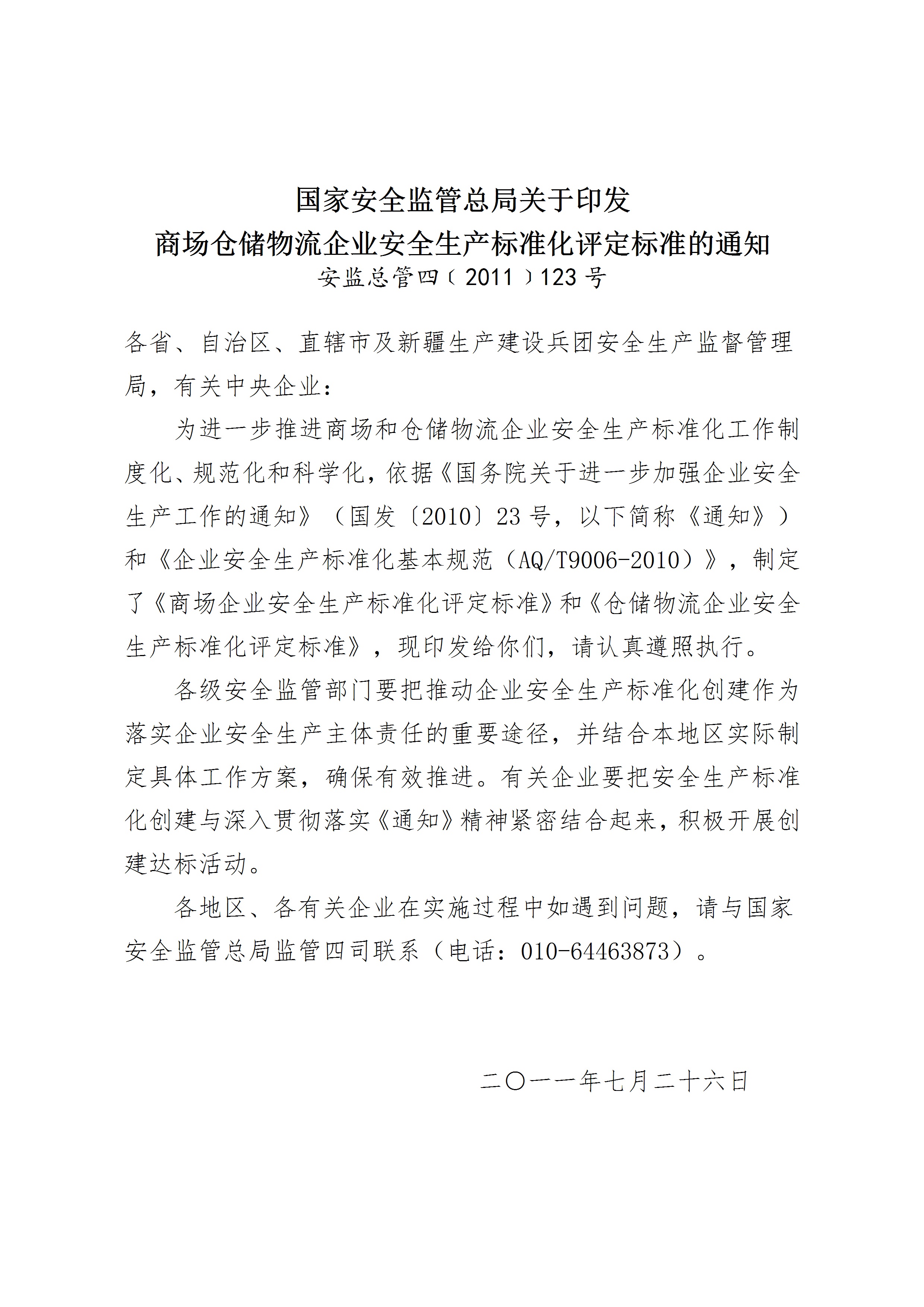 安监总管四(2011)123号商场.仓储物流国家安全监管总局关于印发商场仓储物流企业安全生产标准化评定标准的通知
