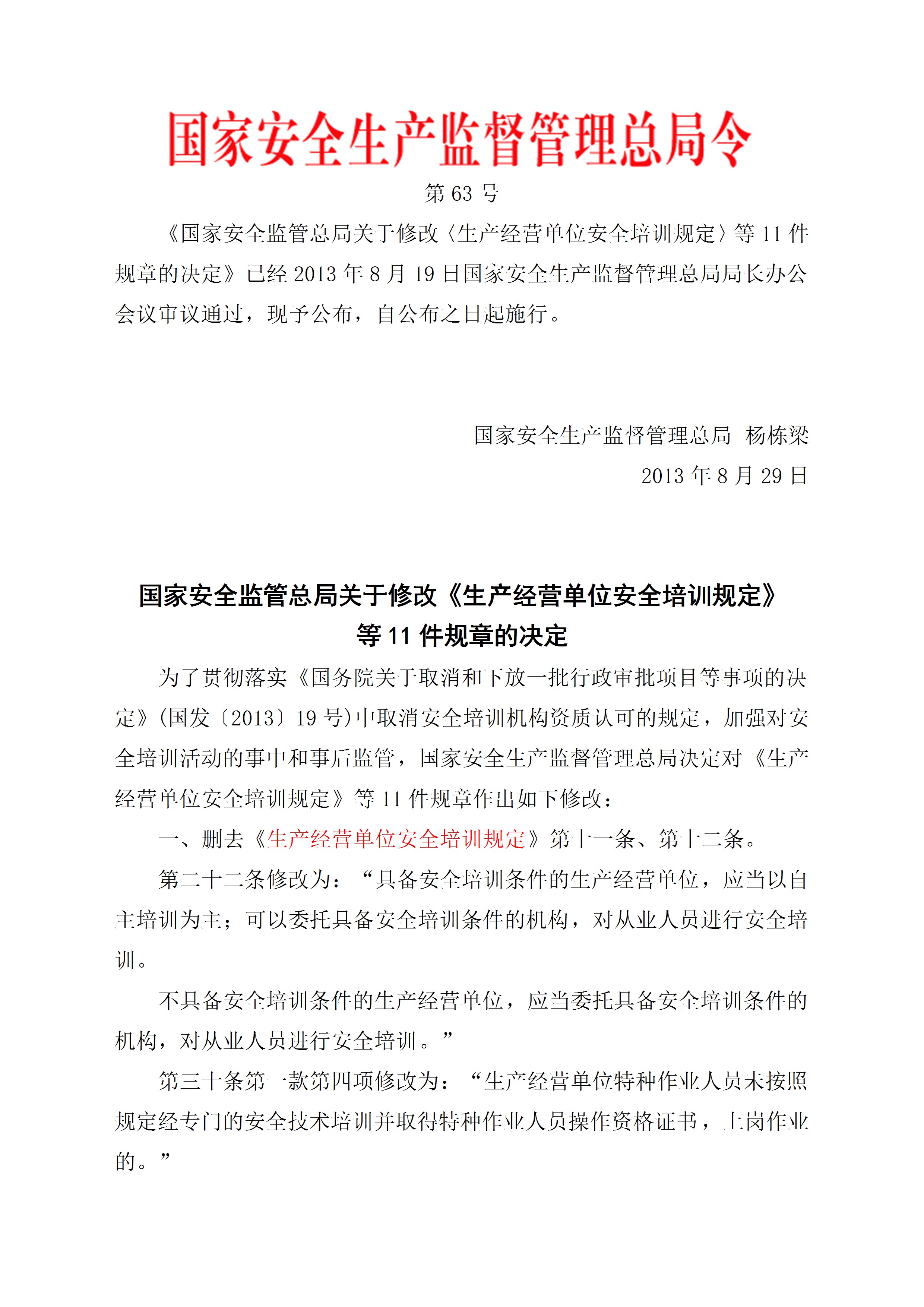 安监总局令[2013]第63号_关于修改生产经营单位安全培训规定等11件规章的决定