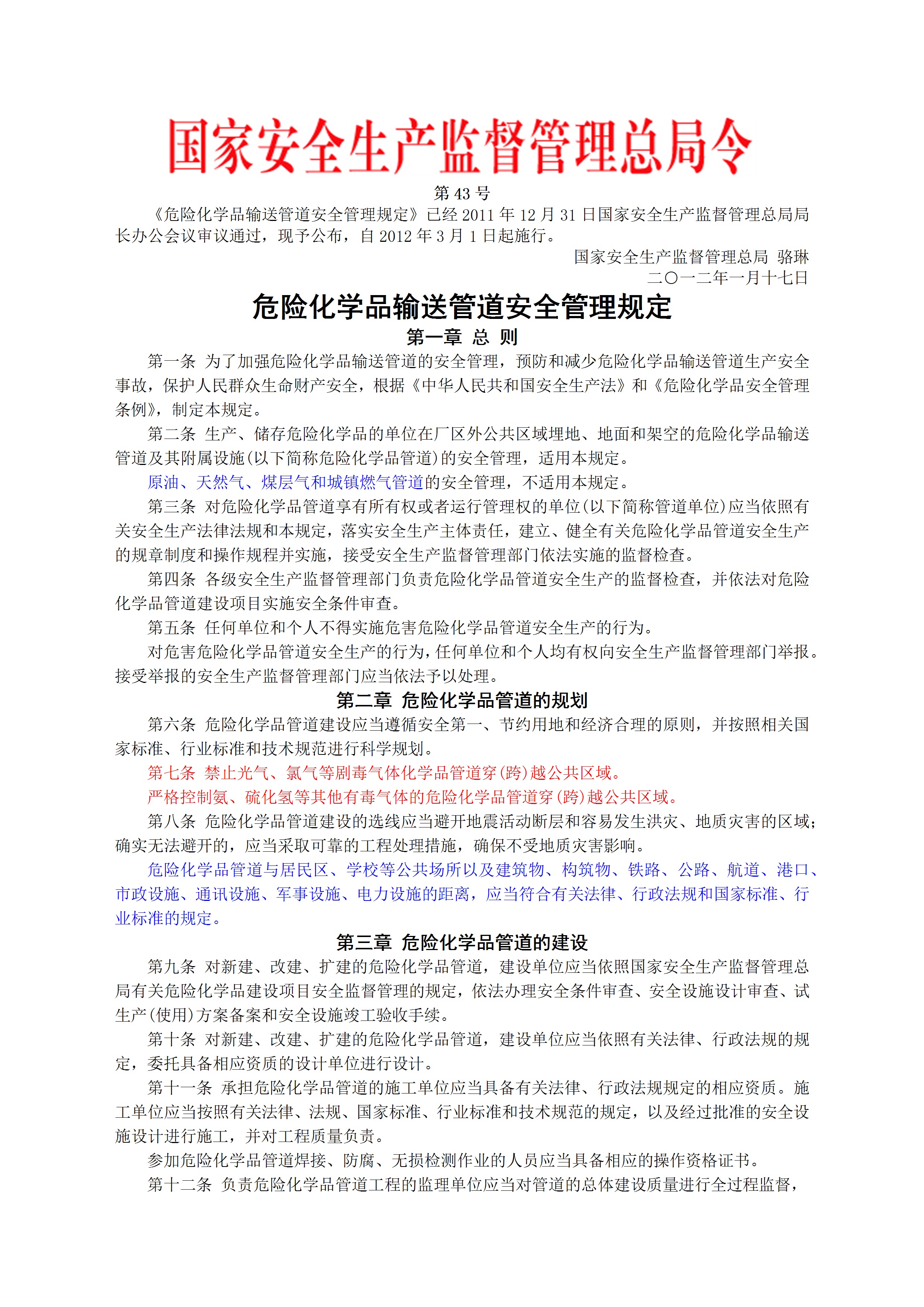 / 安监总局令[2012]第43号_危险化学品输送管道安全管理规定